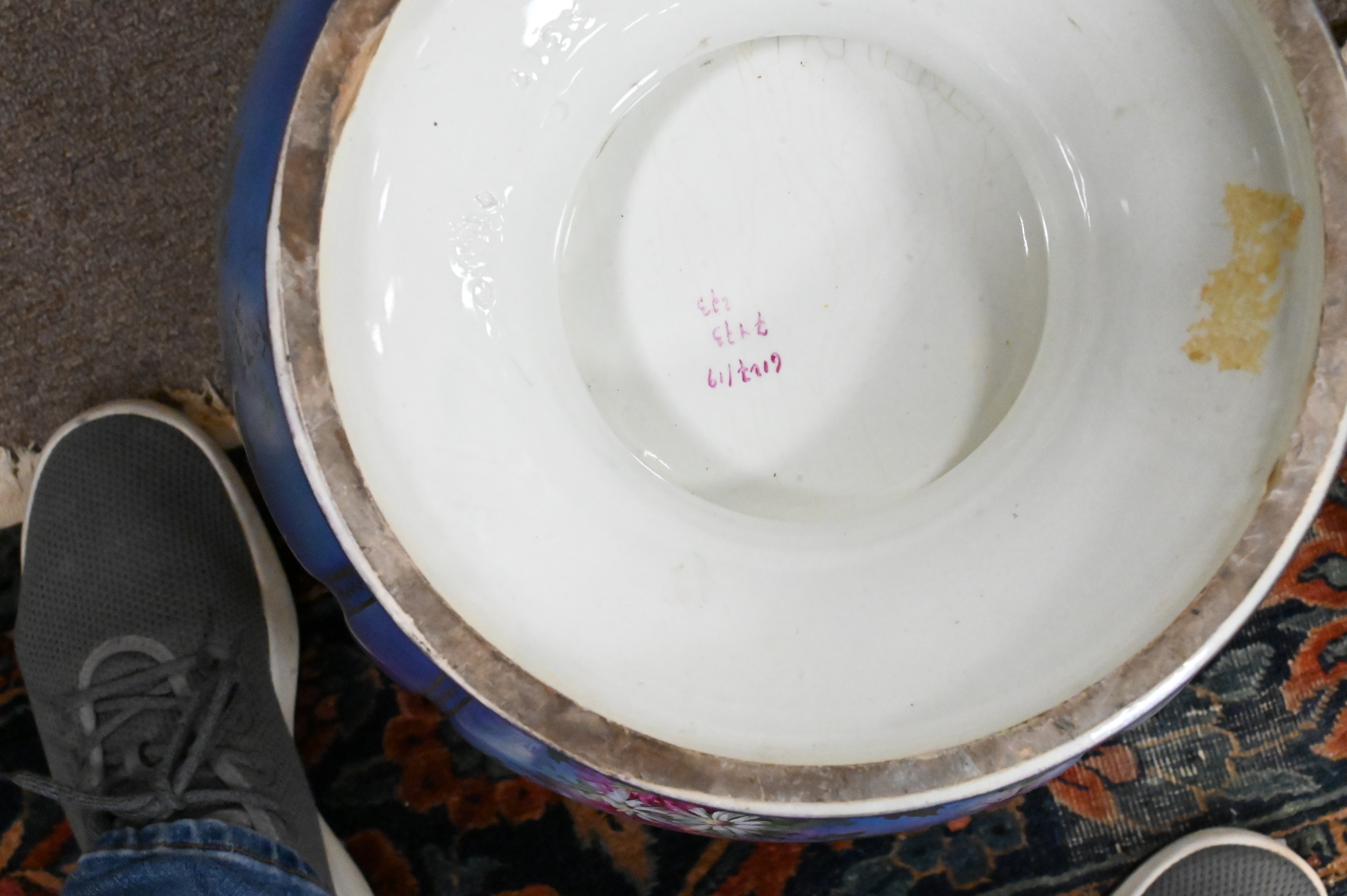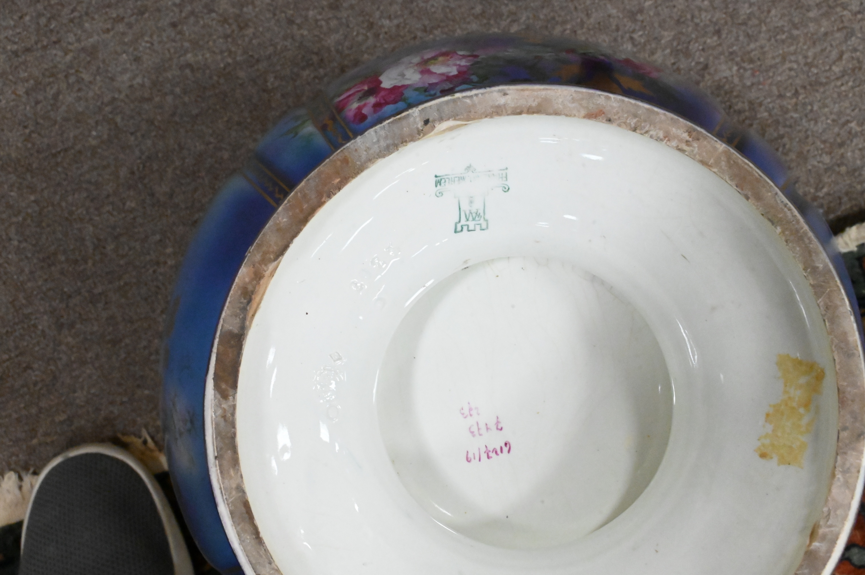 German painted and parcel gilt, having pink floral motif over blue ground, marked on base