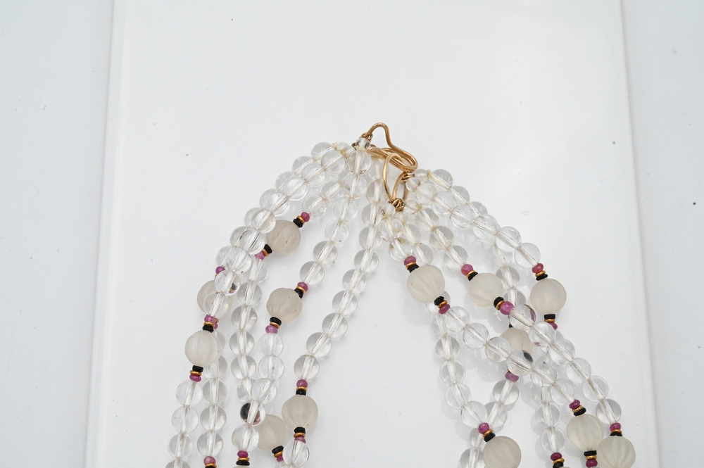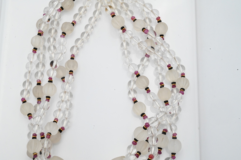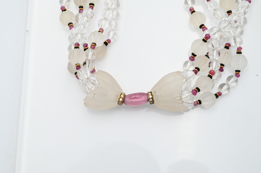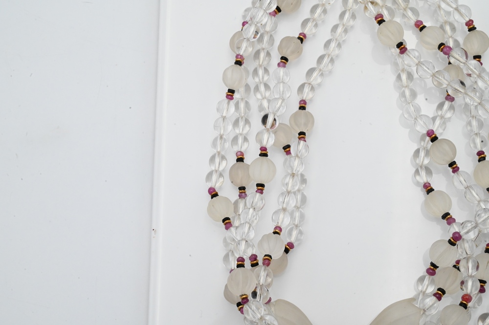 Lot 132: Glass Beaded Necklace, having amethyst, clear and frosted glass beads, gold clasps and spacers, center mounted with 20 small diamond…
