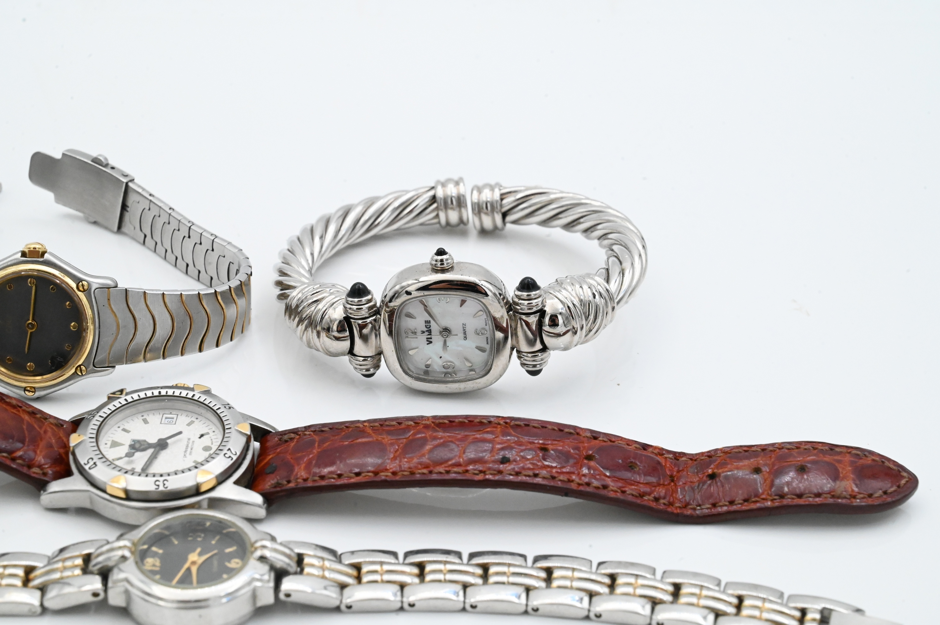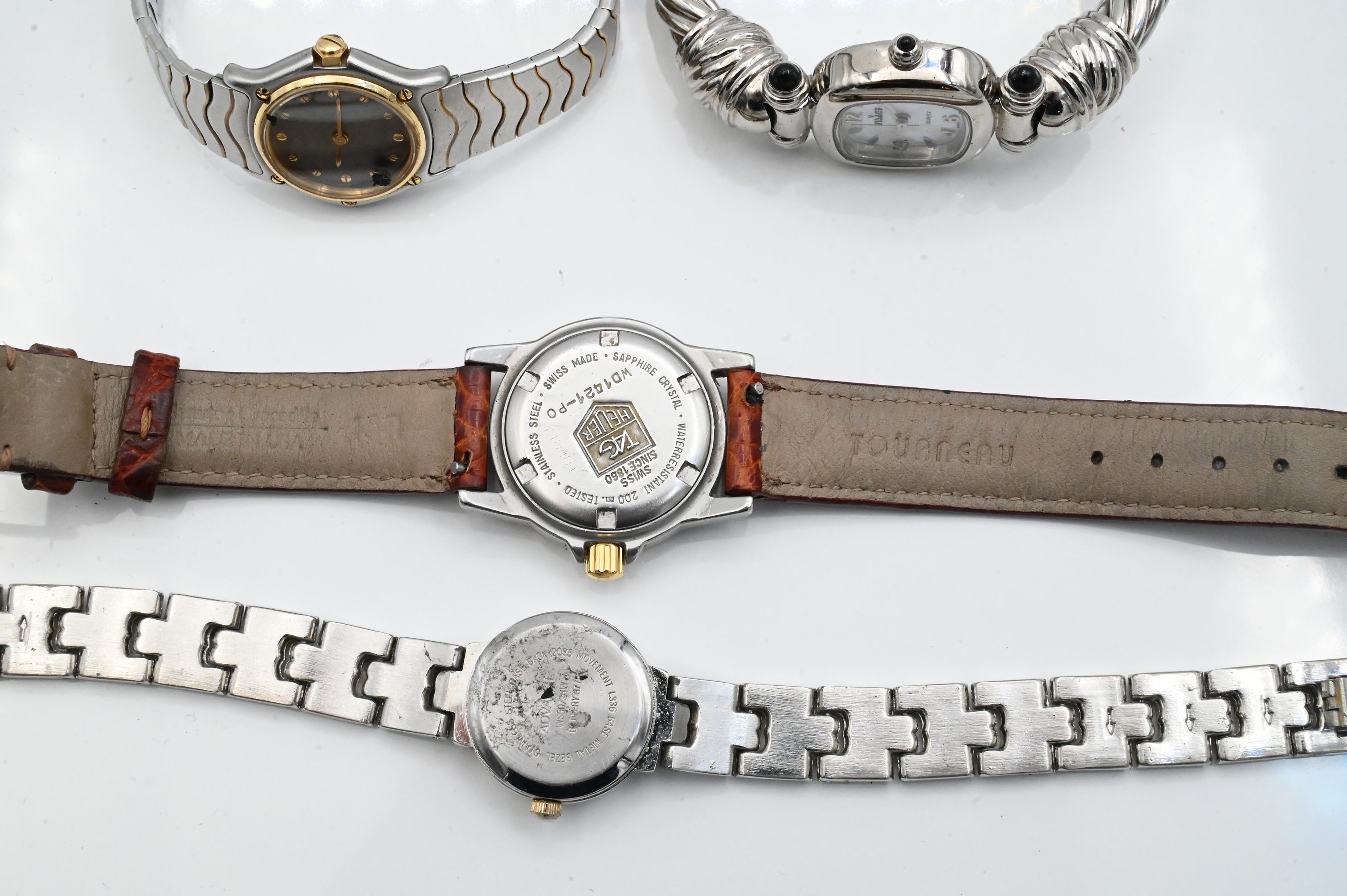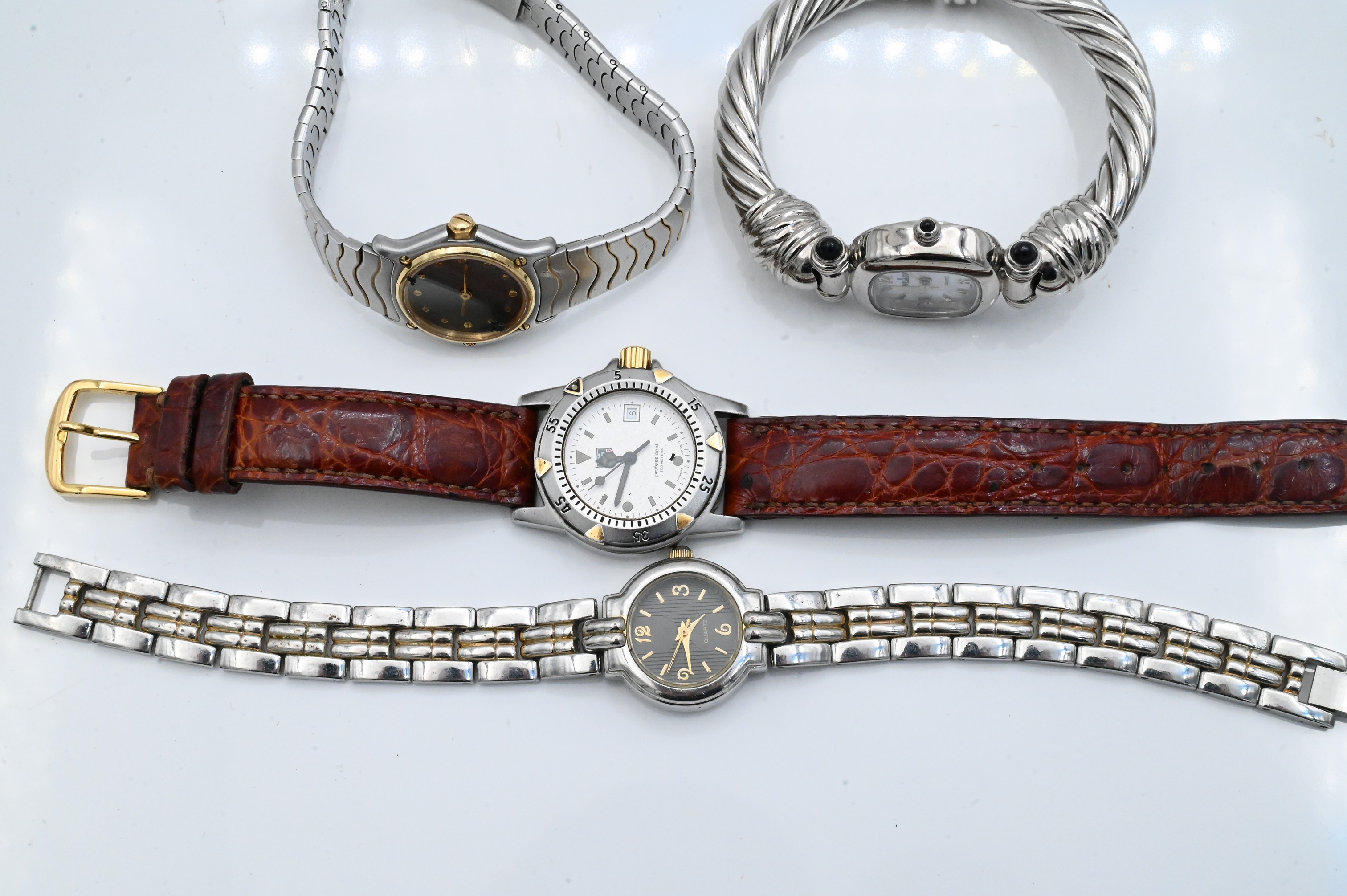 Comprising: one Ebel two-tone stainless steel and gold-plated quartz wristwatch, black dial with gold markers and “wave” bracelet; one Tag Heuer Professional 200 Meters stainless steel and gold-tone quartz wristwatch with date window and brown leather strap; one Visage silver-tone quartz cable-form bangle watch with cabochon accents.