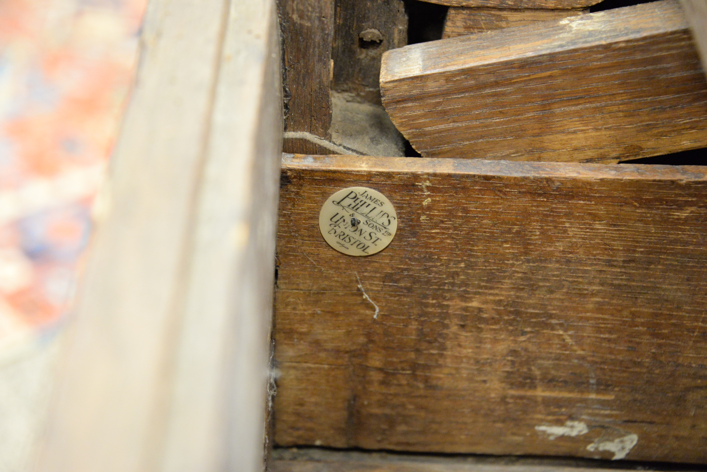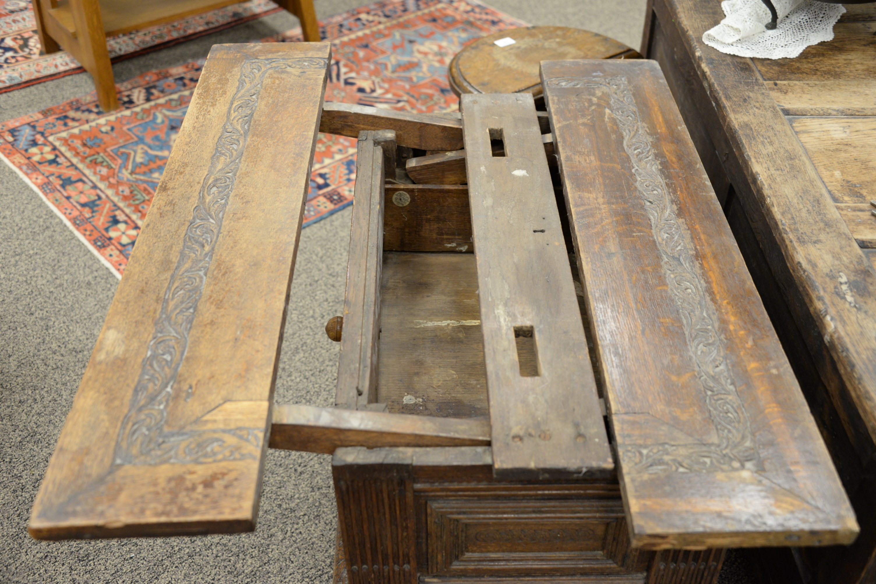 Jacobean Style Carved Oak Table/Cabinet with Drawer,carved and fluted, the carved top extending from either side, on turned legs, height 29 inches, top 35 1/2″ x 36 1/2″ when open.