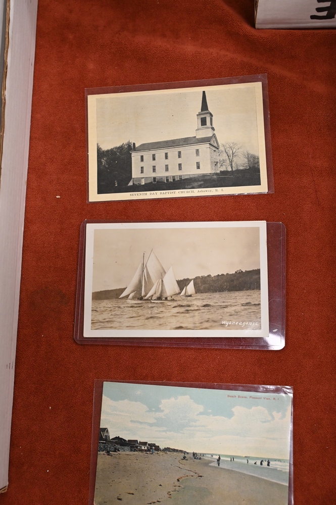 Large Lot of Postcards, in boxes, from Maine, Rhode Island, and New Hampshire, topics include ocean scenes, churches, boats, etc.