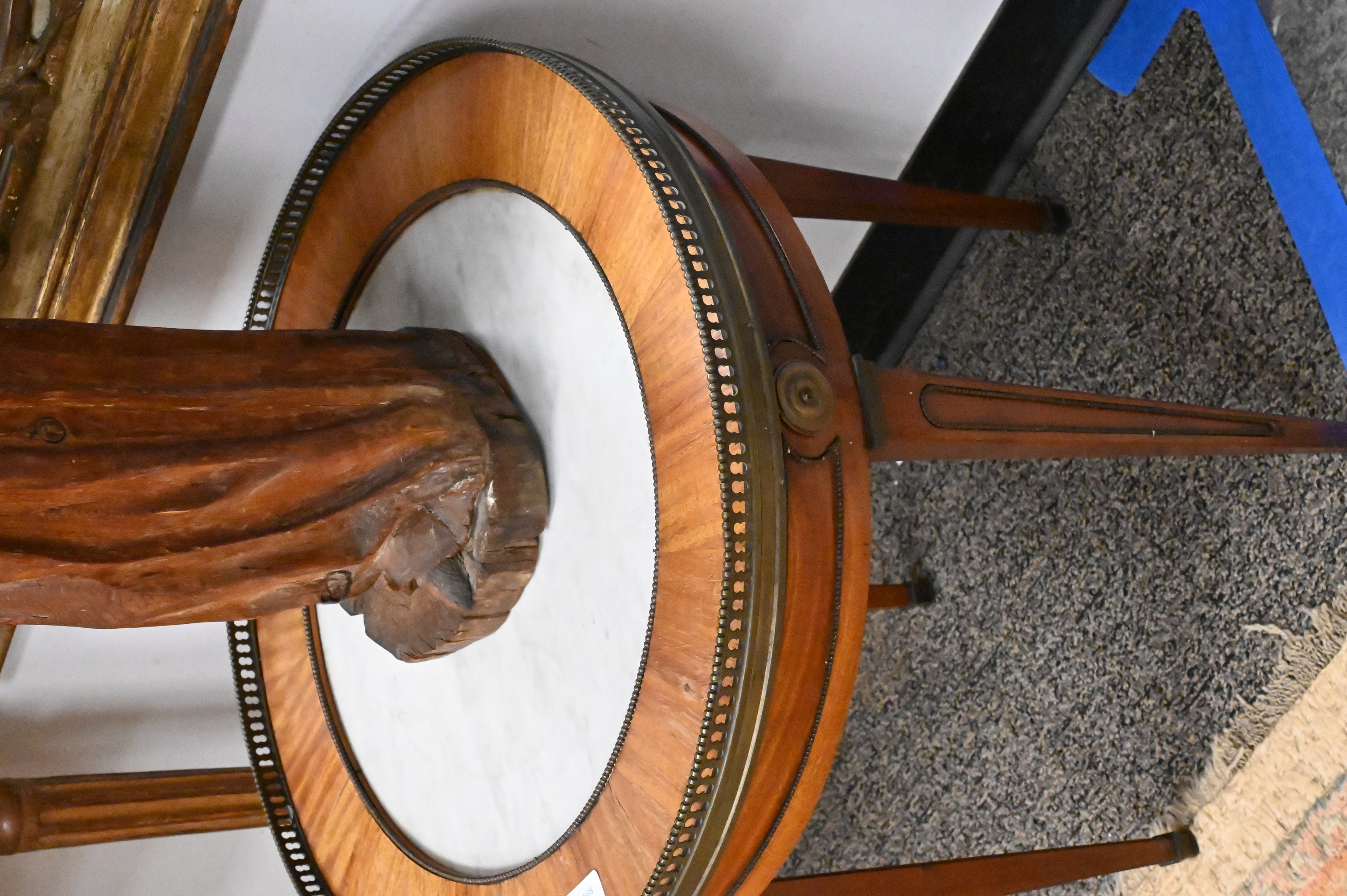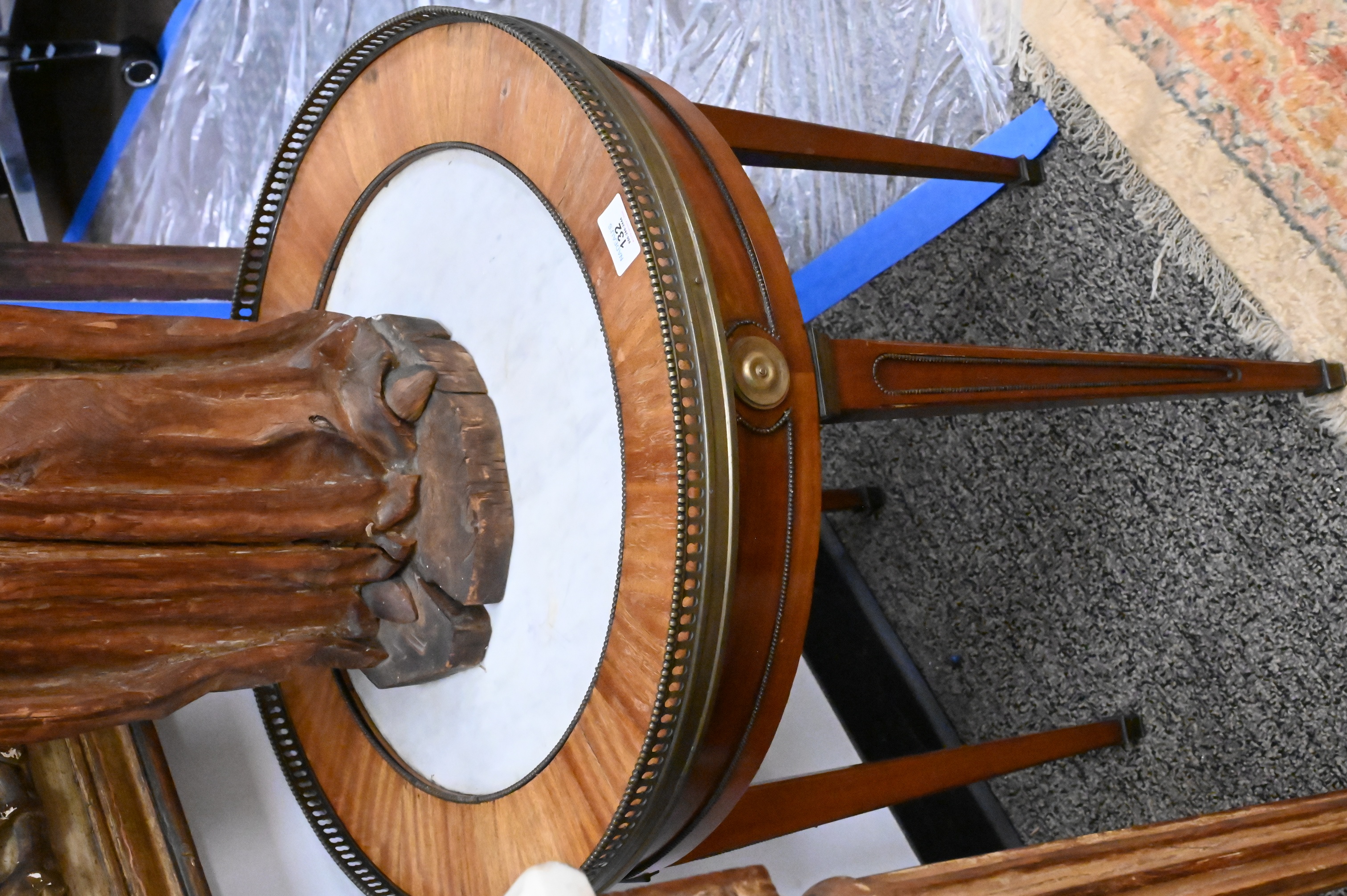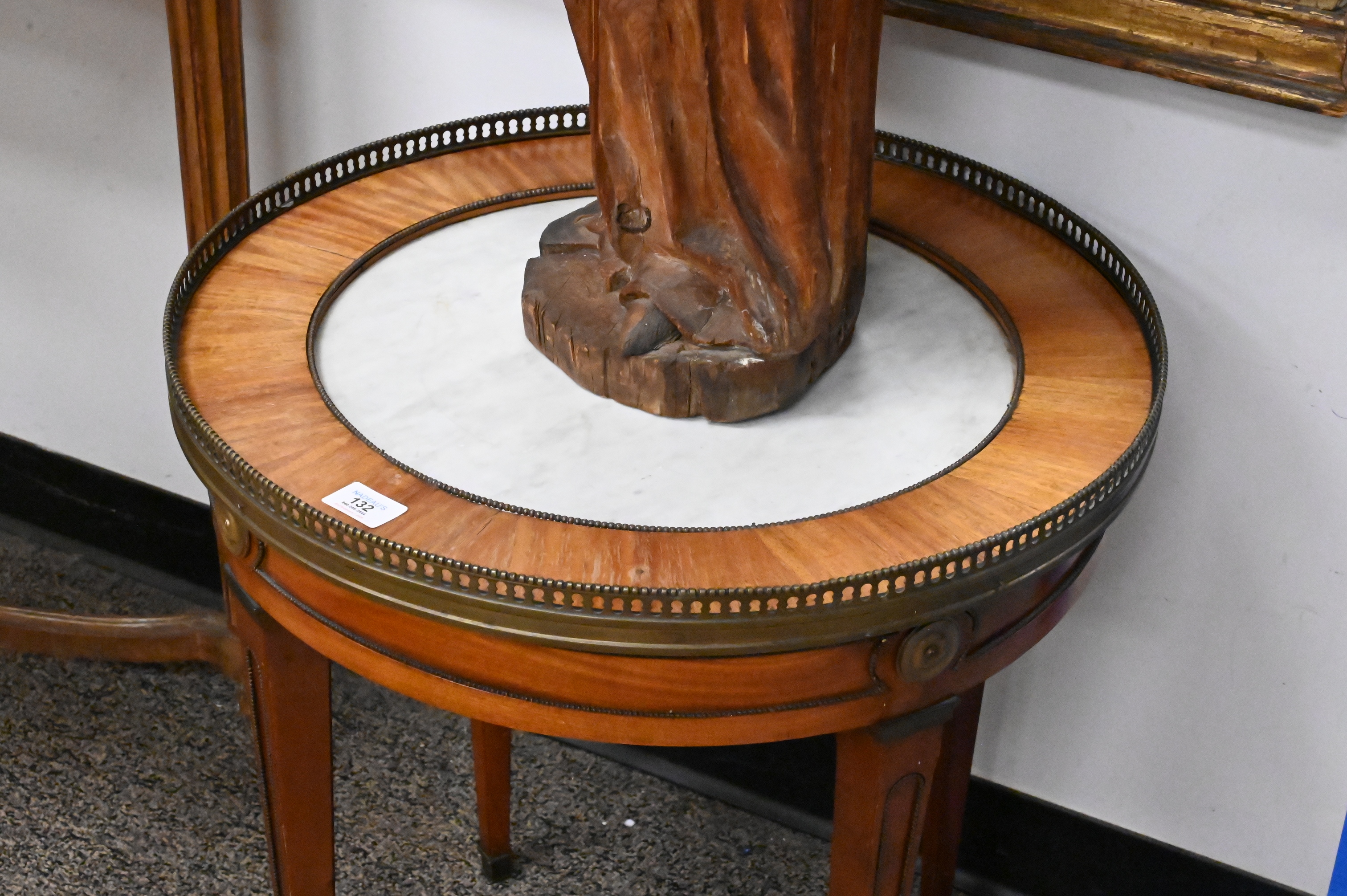 with a circular white marble top enclosed by a pierced brass gallery, the gallery edge, marble surround, frieze, and tapering legs all decorated with brass beaded ornament, raised on square tapering legs with brass-capped feet, French, 19th/20th Century
