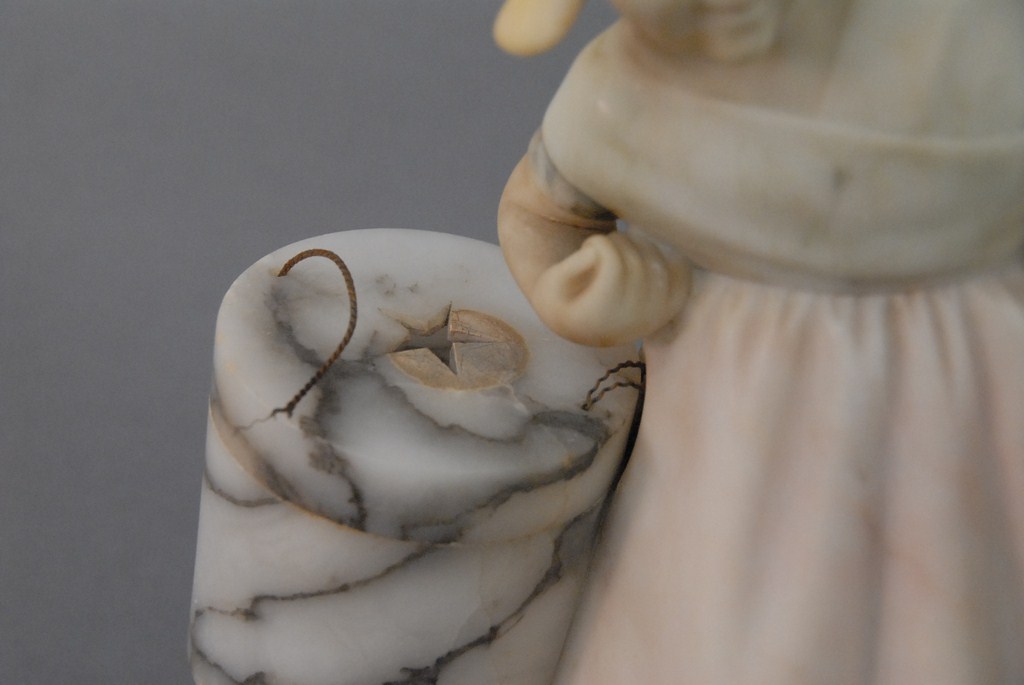 Marble sculpture of Dutch girl with two marble drums, each fitted with small bulb night light. ht. 14 1/4in. Provenance: Estate of Judy McDonough Gengras of Stoner Drive, West Hartford, Connecticut.