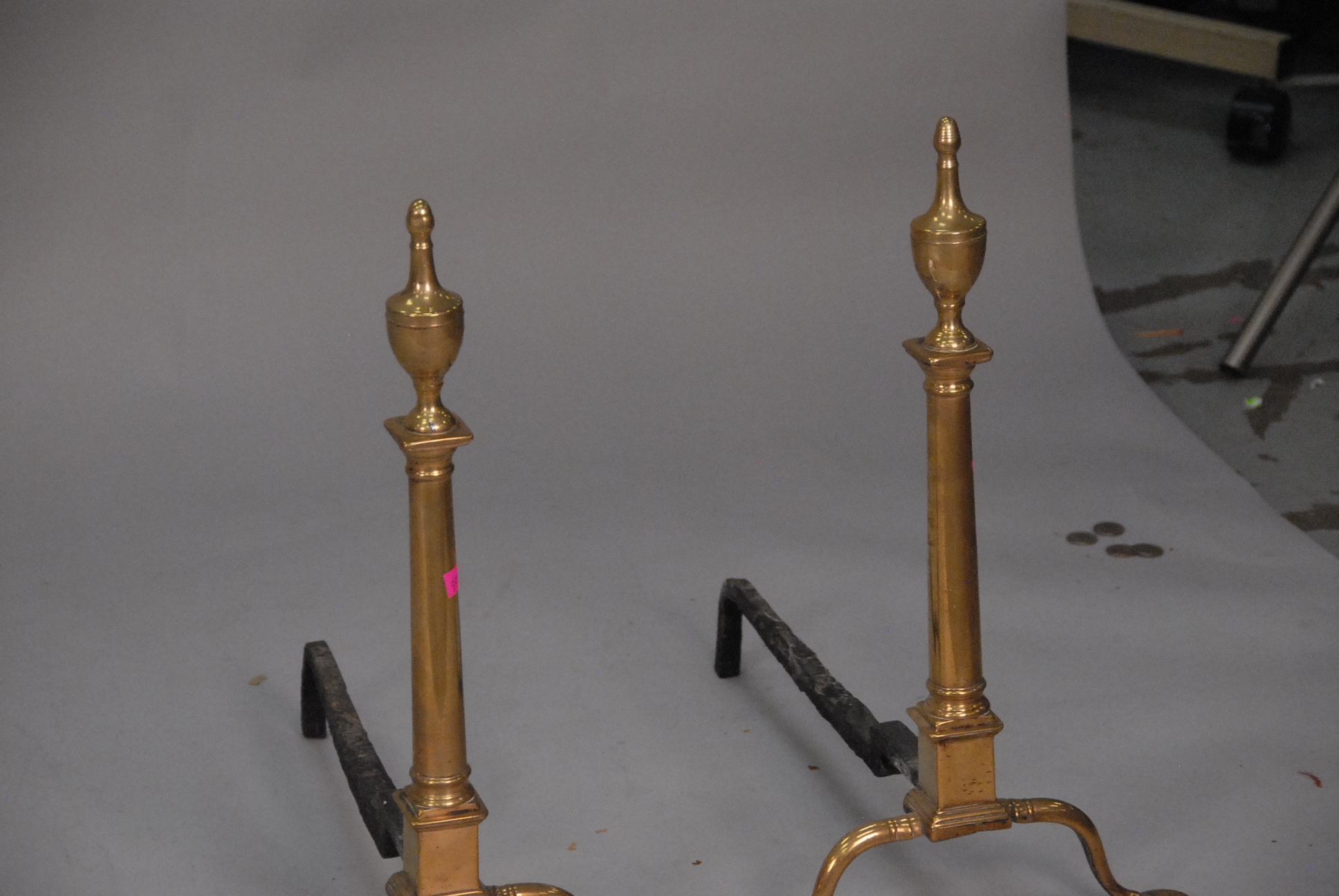 Lot 132: Pair of Federal brass andirons having urn tops on turned shaft with square base on curved legs ending in penny feet, circa 1790-1810 ht. 22in.