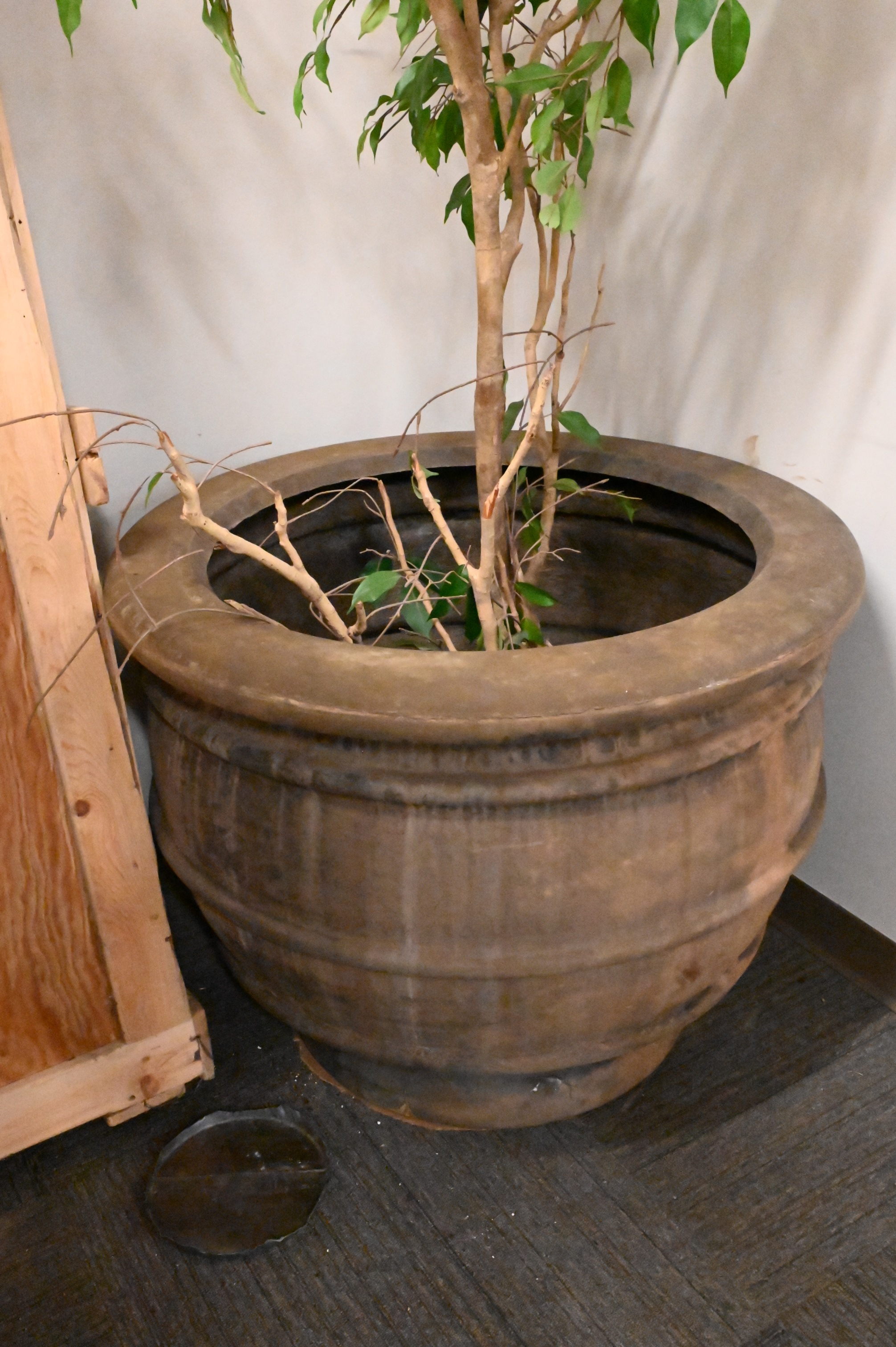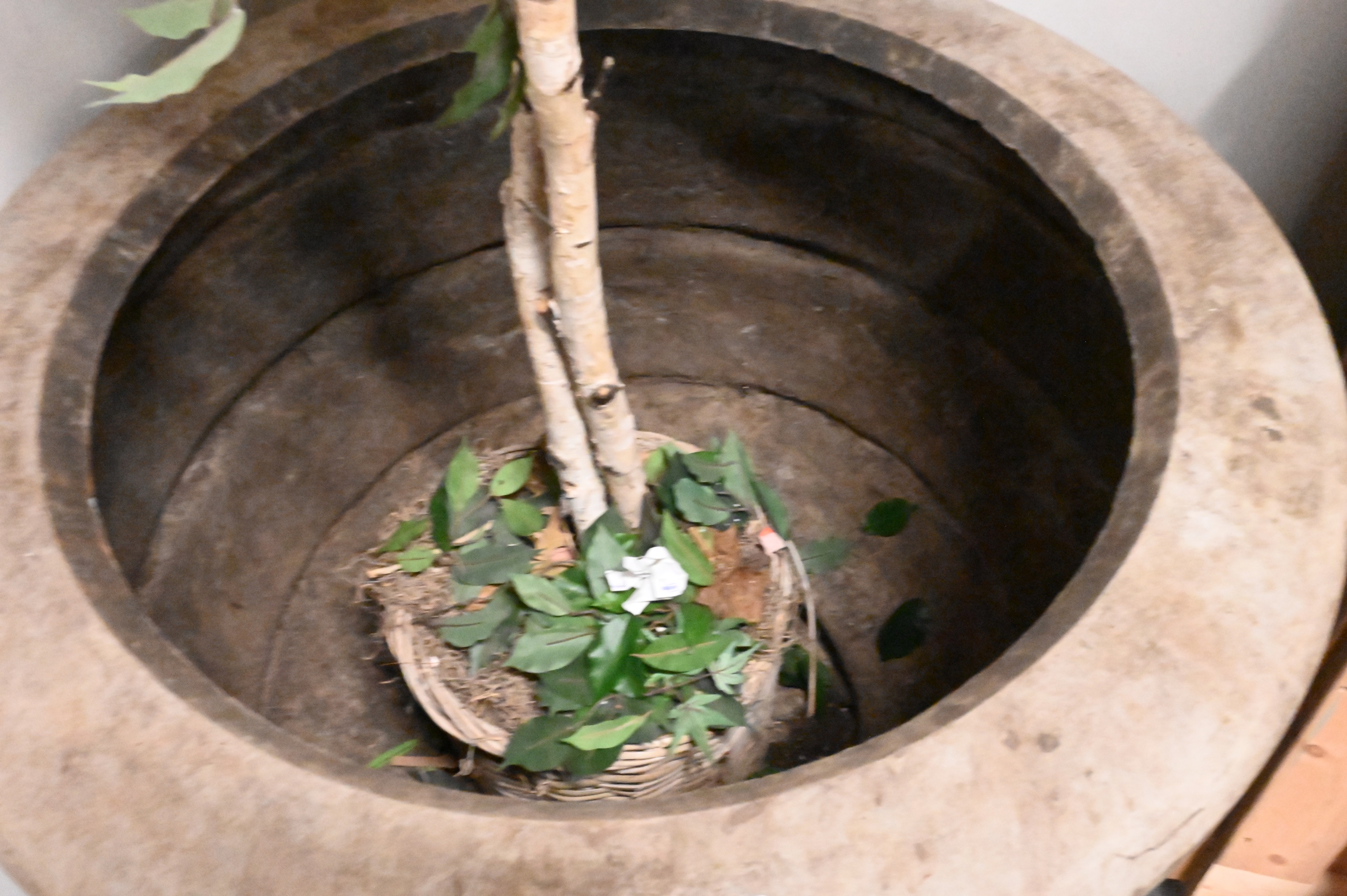 Pair of Monumental Composite Outdoor Planters, one with break at the base, height 28 inches, diameter 35 inches.