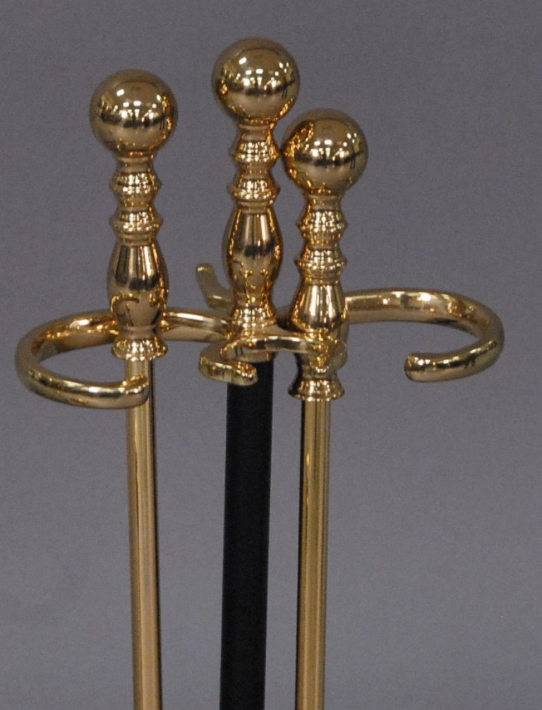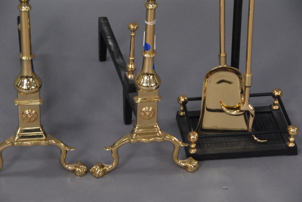 Pair of Virginia Brass andirons with ball tops, log stops, and matching tools. height 23in. width 10in.