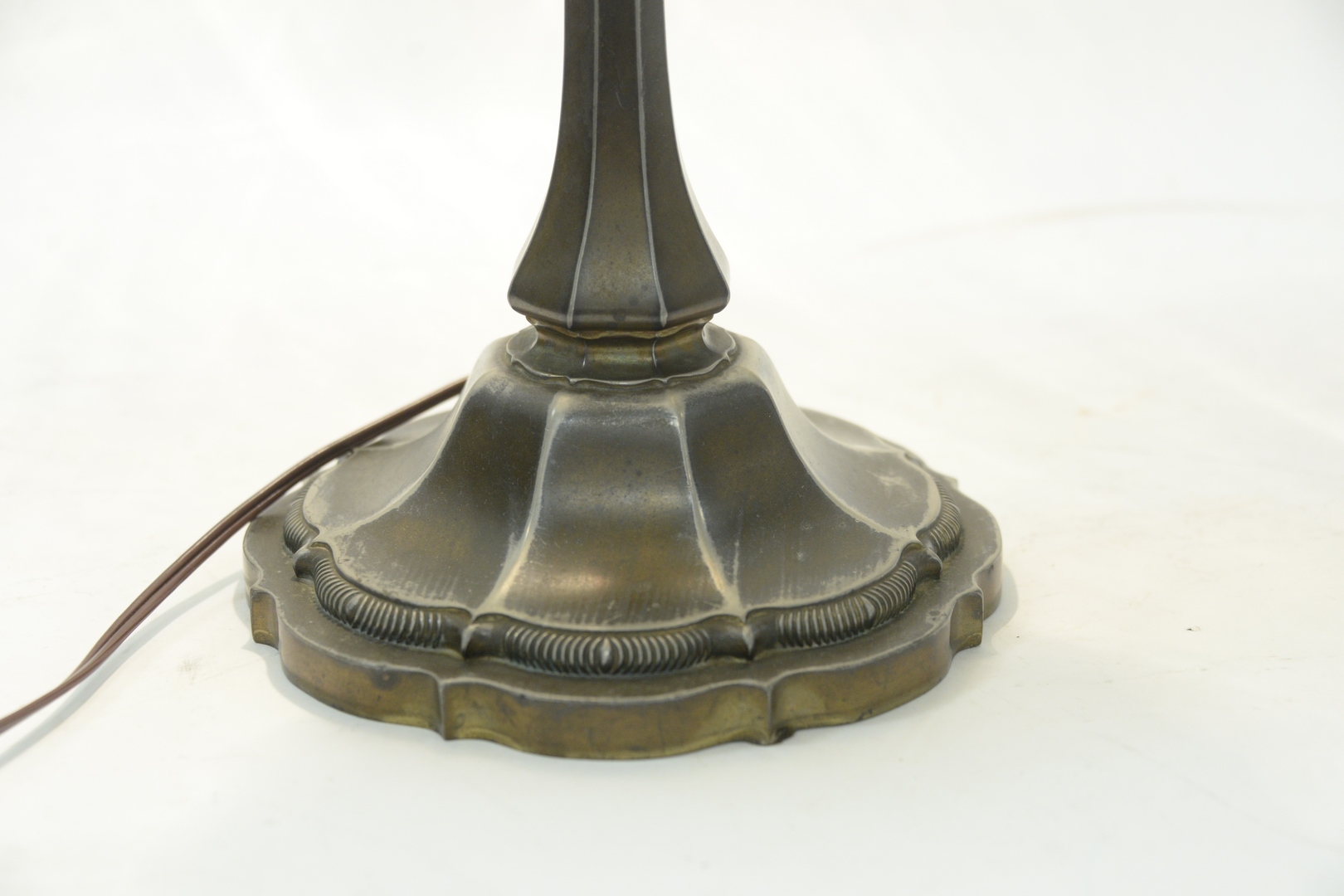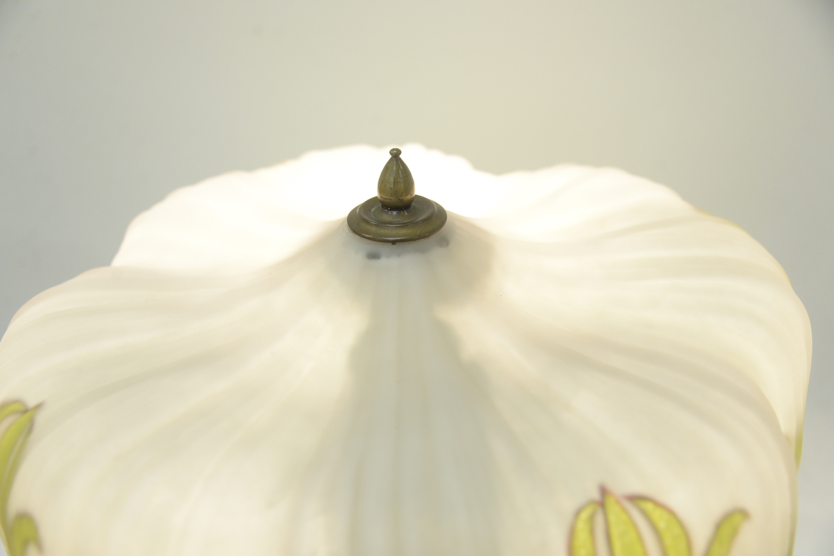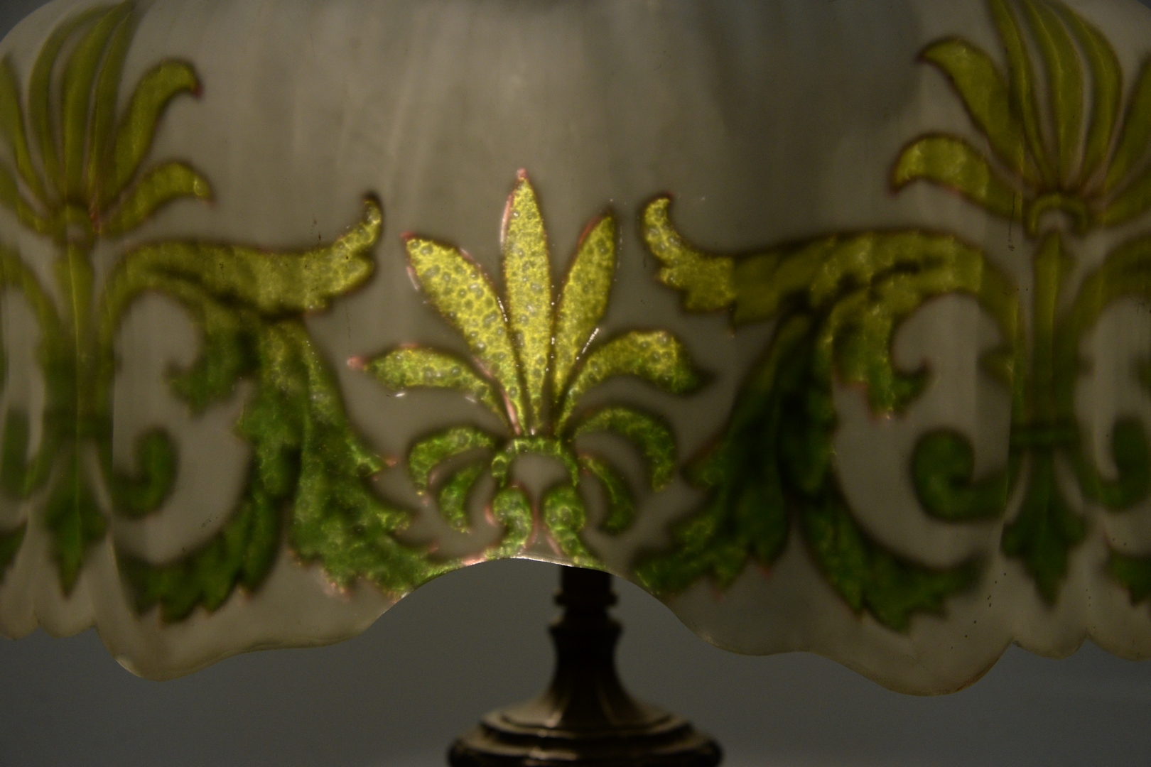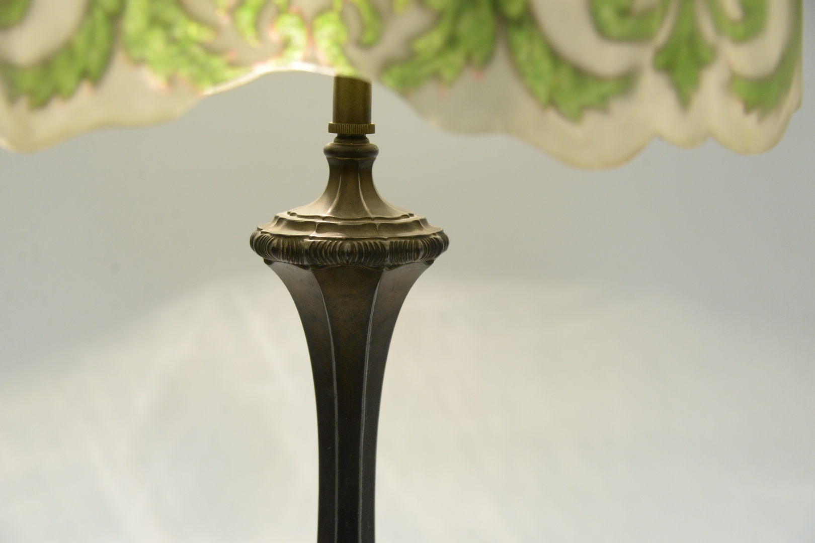 Lot 132: Pairpoint Table Lamp having frost pleated glass shade with green reverse painted scrolling acanthus leaves on metal base, marked Pairpoint Manufacturing C3063, shade signed The Pairpoint Corporation, height 22 inches, shade diameter 14 inches. Proven