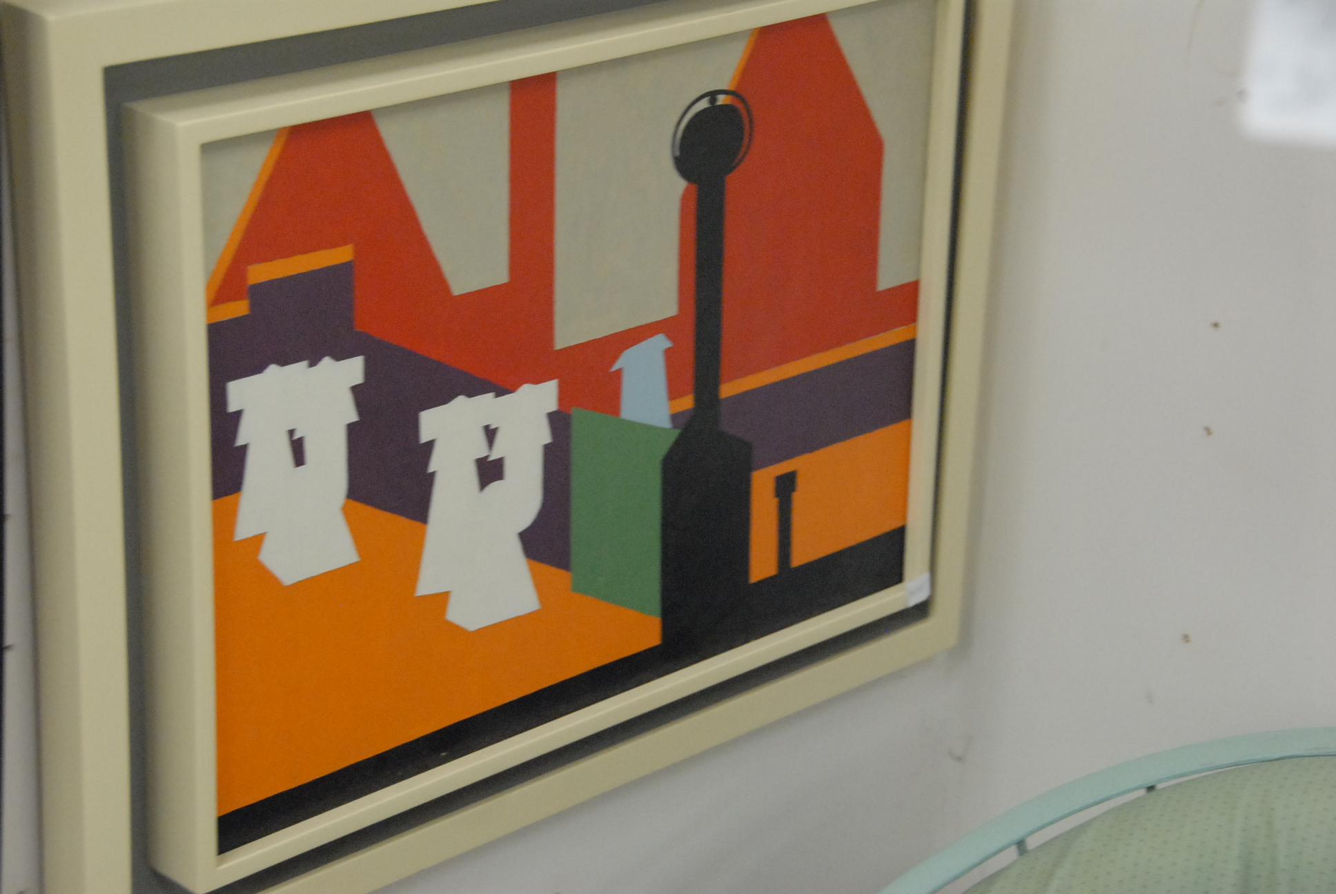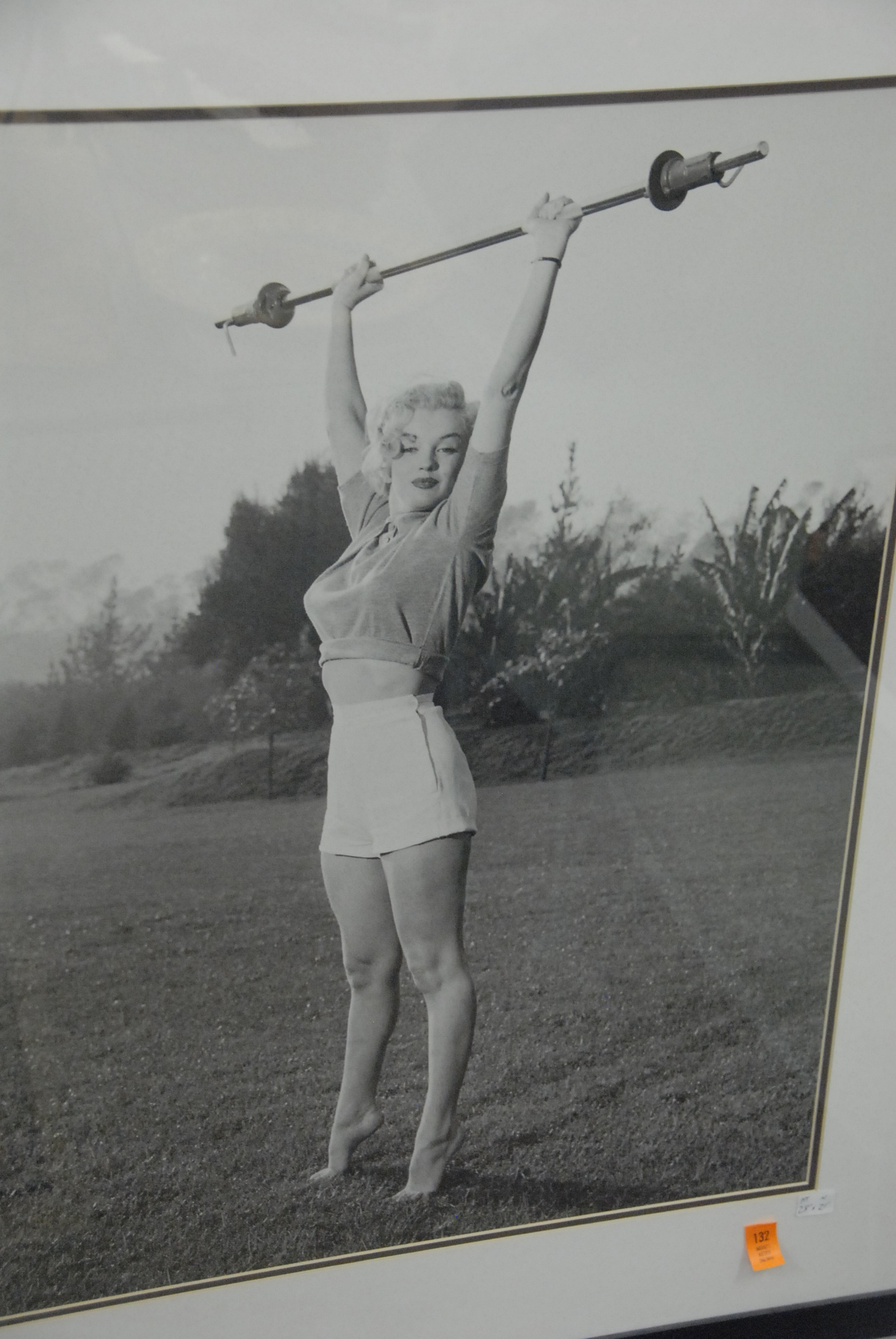 Print of Marilyn Monroe lifting weights, along with a contemporary painting.
