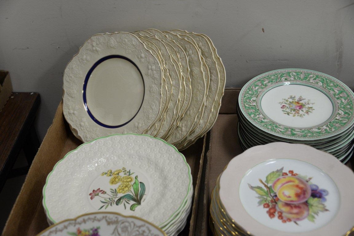 Seven box lots of plates, partial dinner sets, gold rim old ivory cups and saucers, Copeland Spode plates, fruit plates, etc.