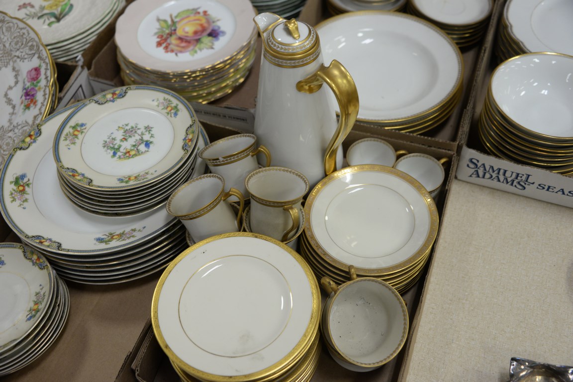 Lot 132: Seven box lots of plates, partial dinner sets, gold rim old ivory cups and saucers, Copeland Spode plates, fruit plates, etc.