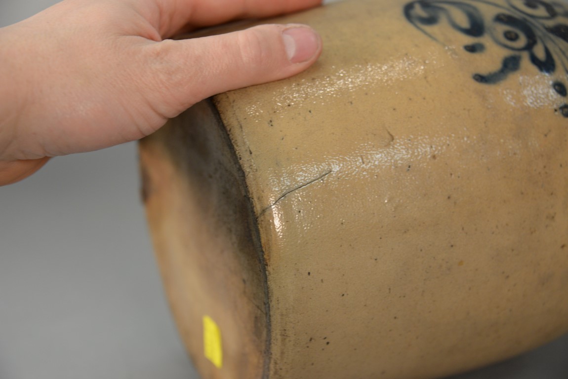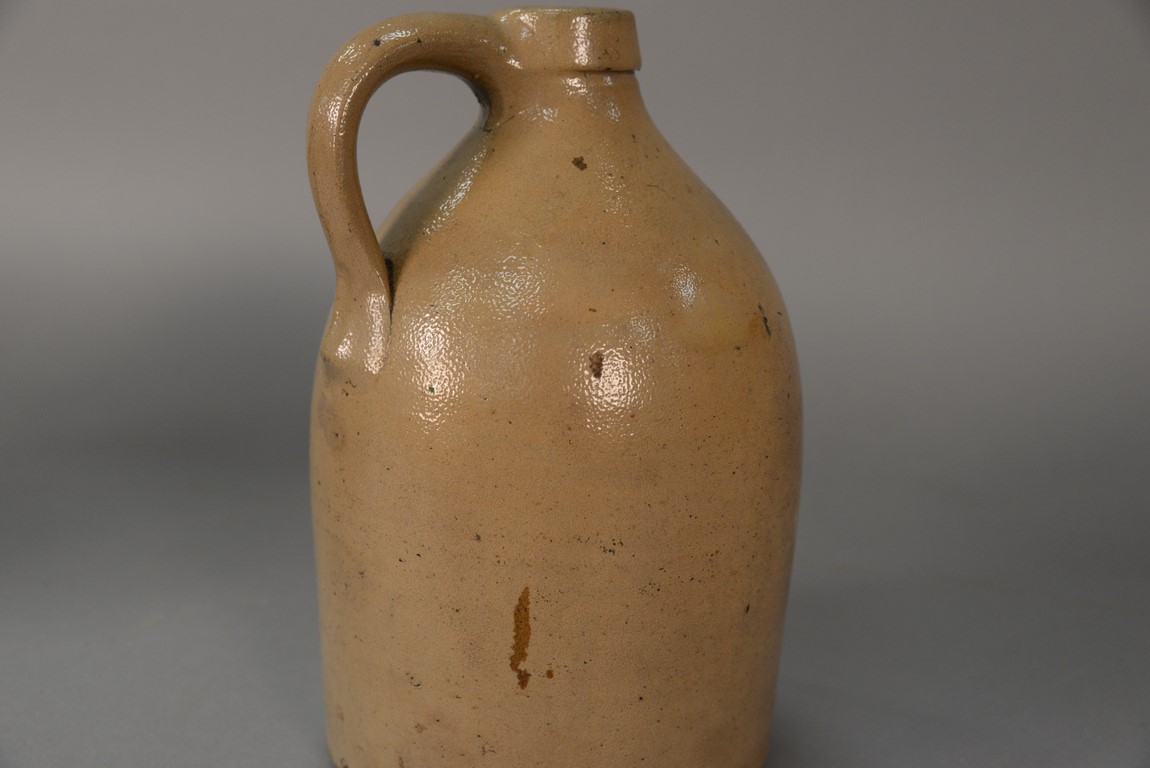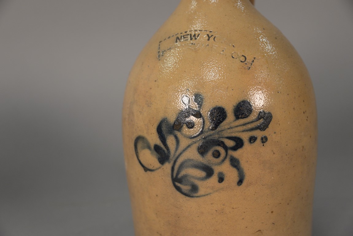 Lot 132: Stoneware jug marked N.Y. Stoneware Co. with blue floral decoration. ht. 11 1/2 in.