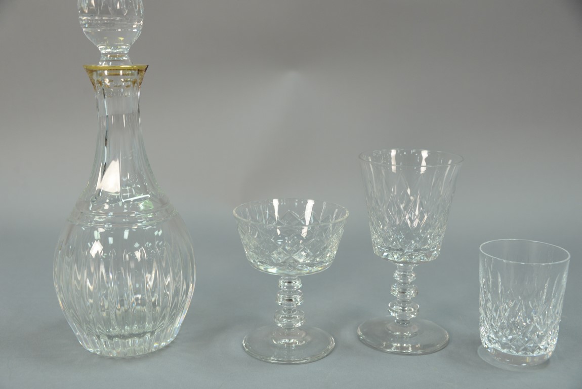 Ten piece Waterford crystal group to include 9 goblets and a decanter with gold rim small chip, along with a set of crystal stem glasses, white and red, 37 total pieces decanter: ht. 12in., stems: ht. 3 1/2in. to 6 1/4in.