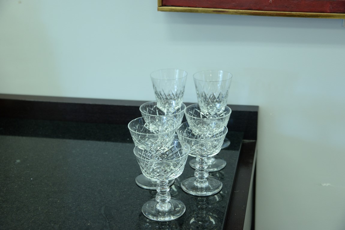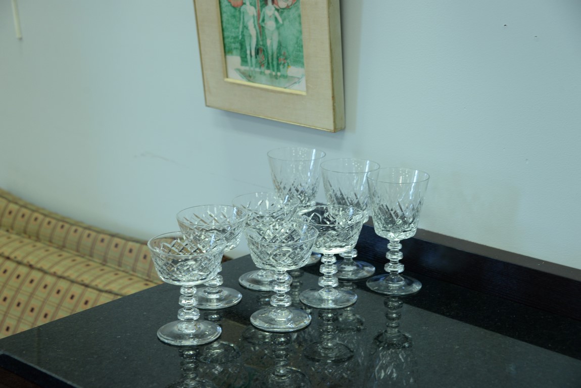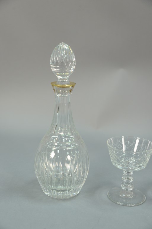 Lot 132: Ten piece Waterford crystal group to include 9 goblets and a decanter with gold rim small chip, along with a set of crystal stem g…