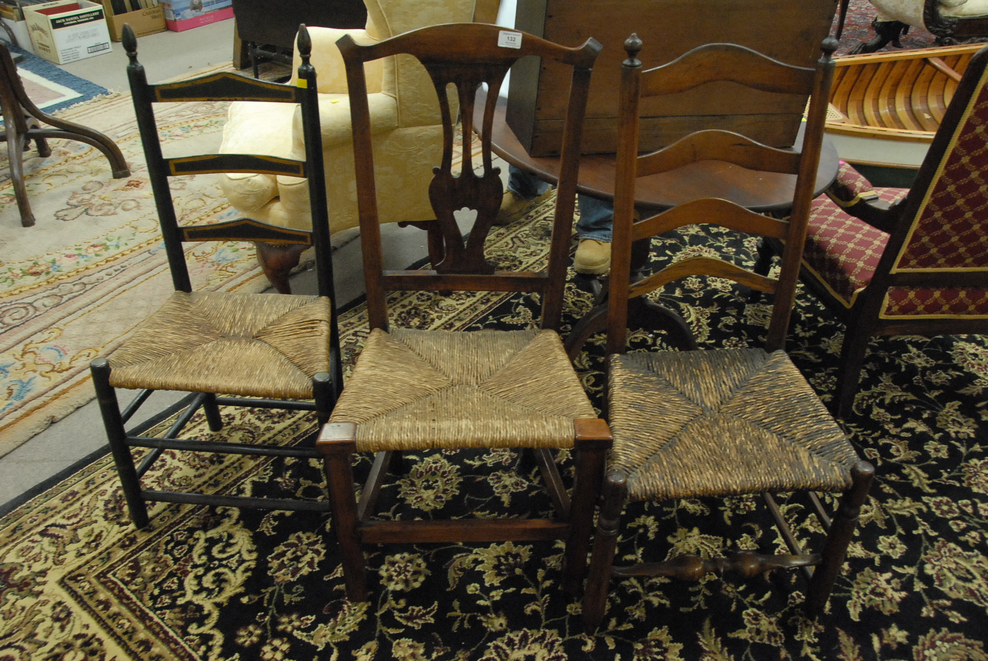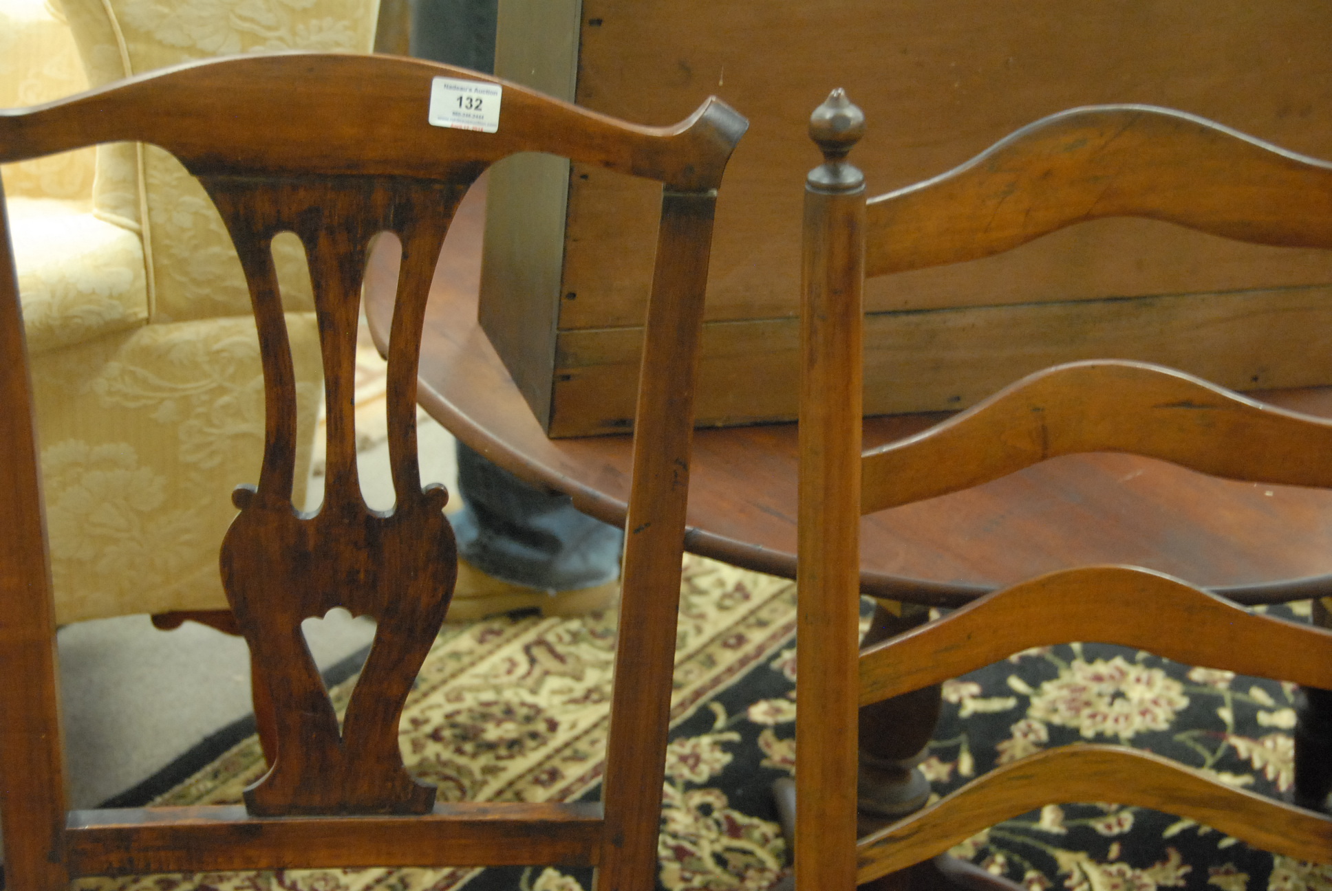 Three early chairs to include two ladder back chairs and one Chippendale side chair.