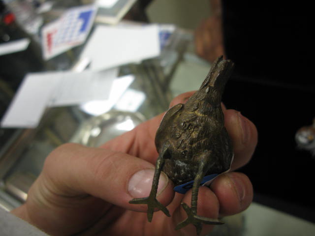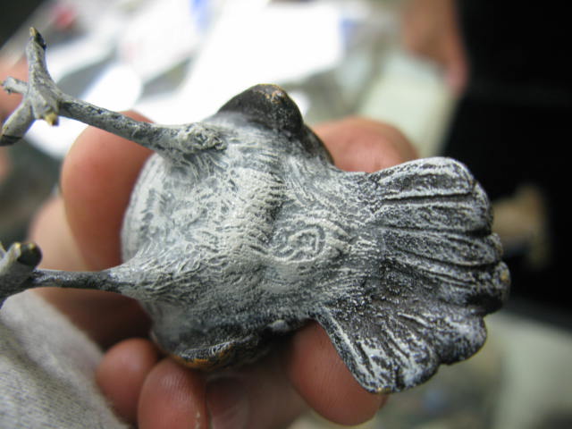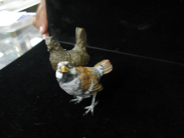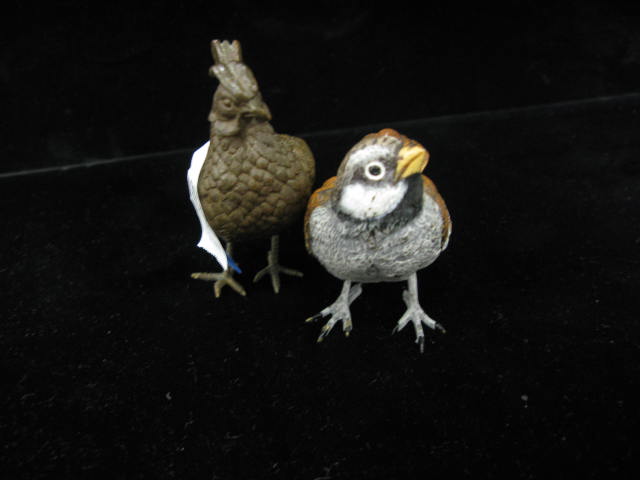 Two bronze birds, one rooster and one is painted
