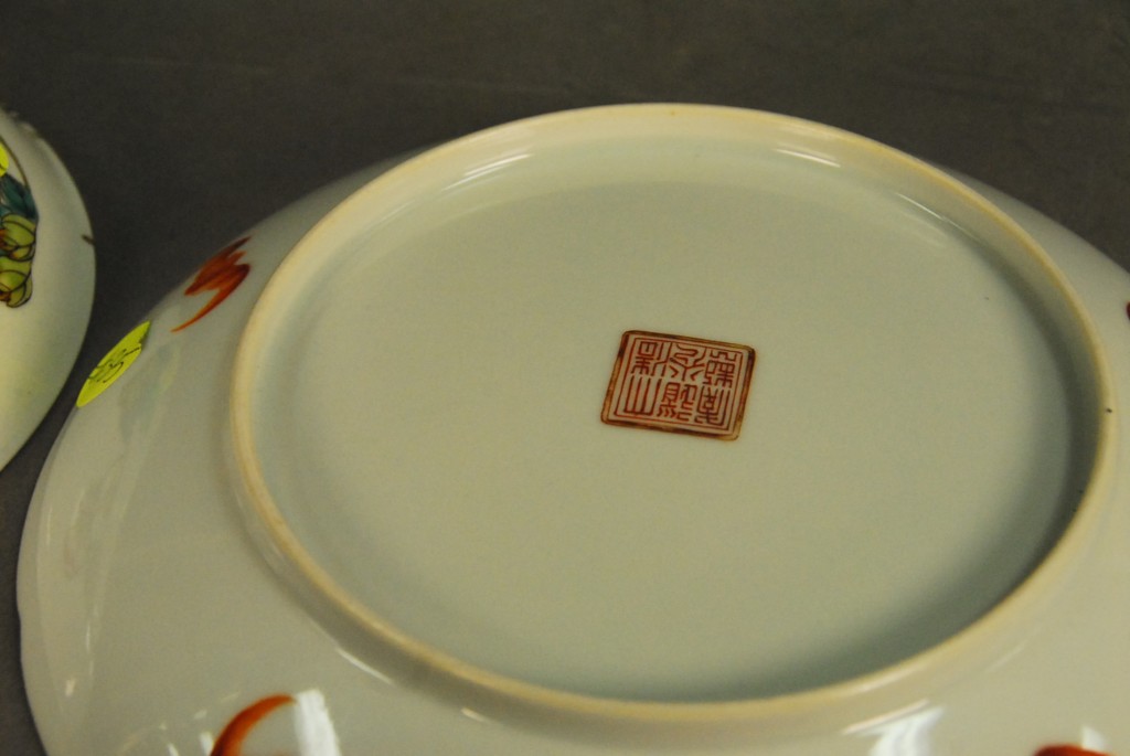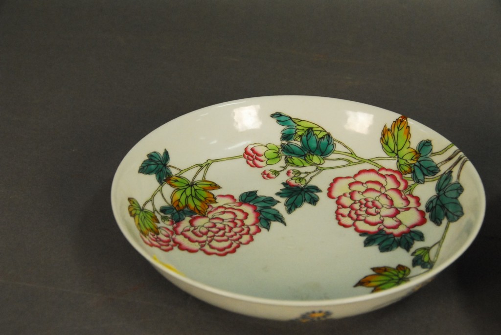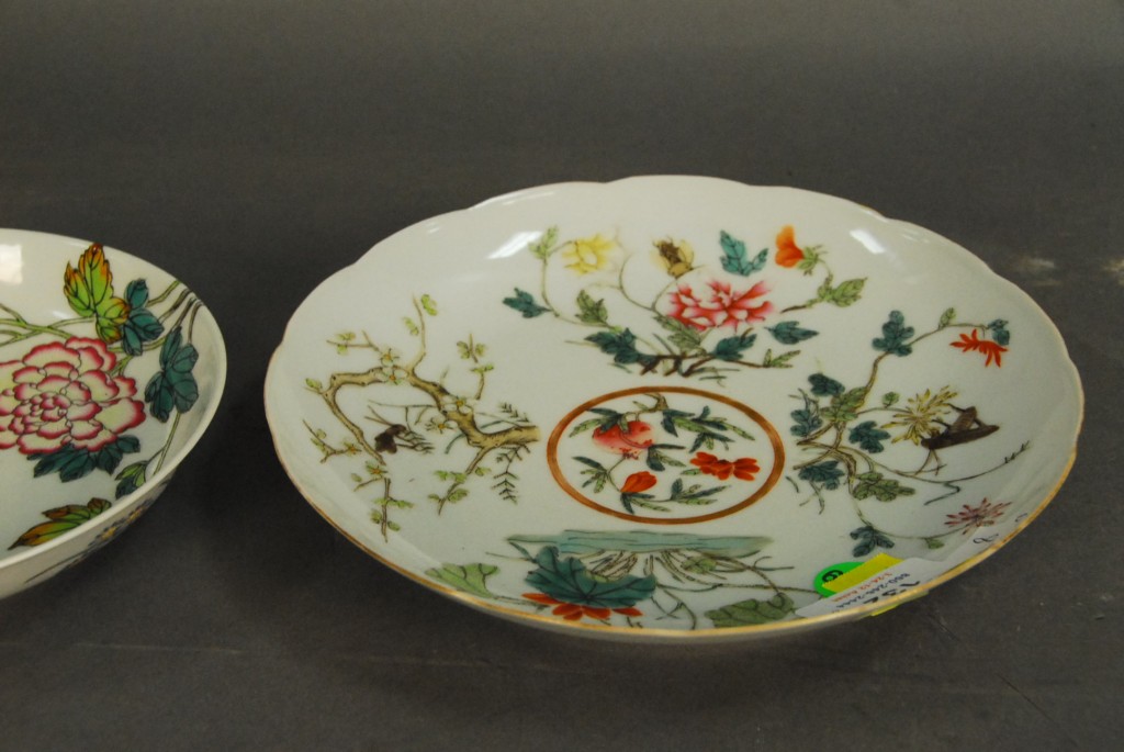 Lot 132: Two piece lot Famille Rose plate having painted trees, bug, wild flowers, and bats, dia. 8 1/4 and Doucai wild flower plate with s…