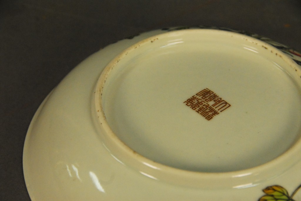 Two piece lot Famille Rose plate having painted trees, bug, wild flowers, and bats, dia. 8 1/4 and Doucai wild flower plate with seal mark on bottom, dia. 6 1/2.