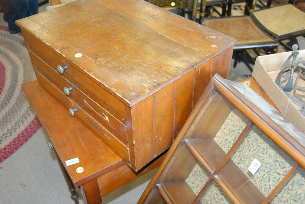 Two piece lot small three drawer cabinet and hanging curio cabinet.