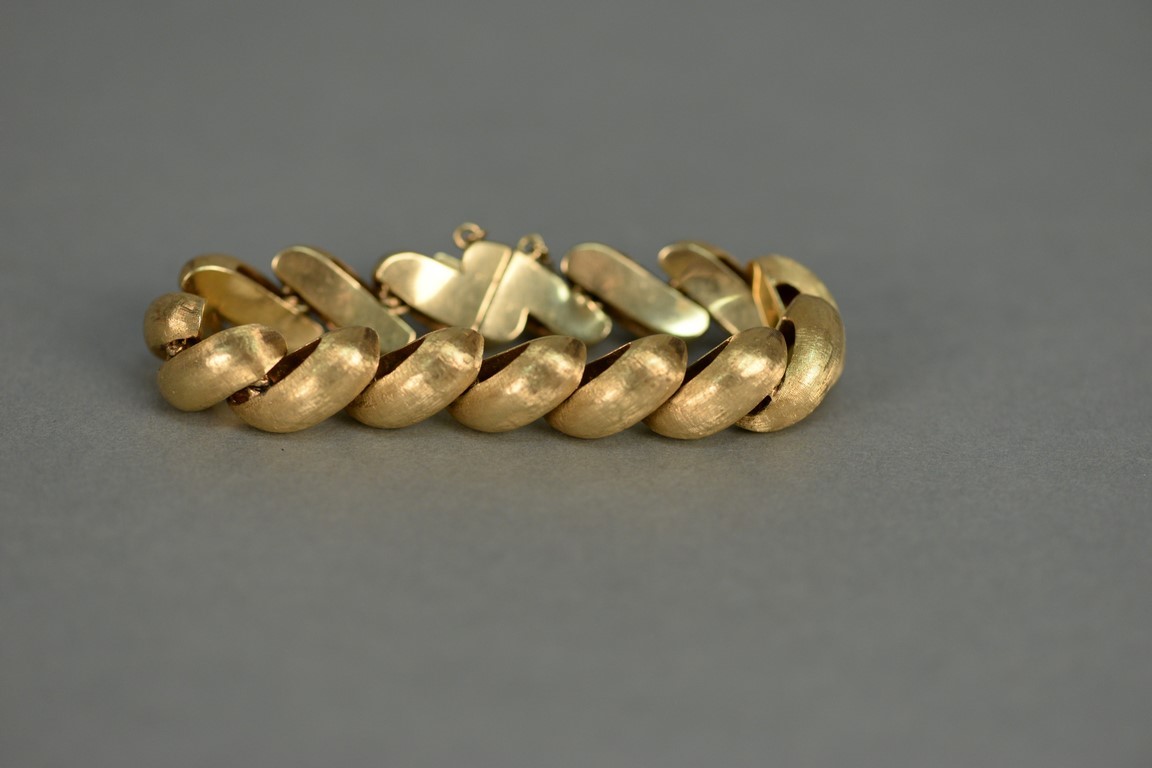 14K brushed gold bracelet marked GVG. 52.7 grams