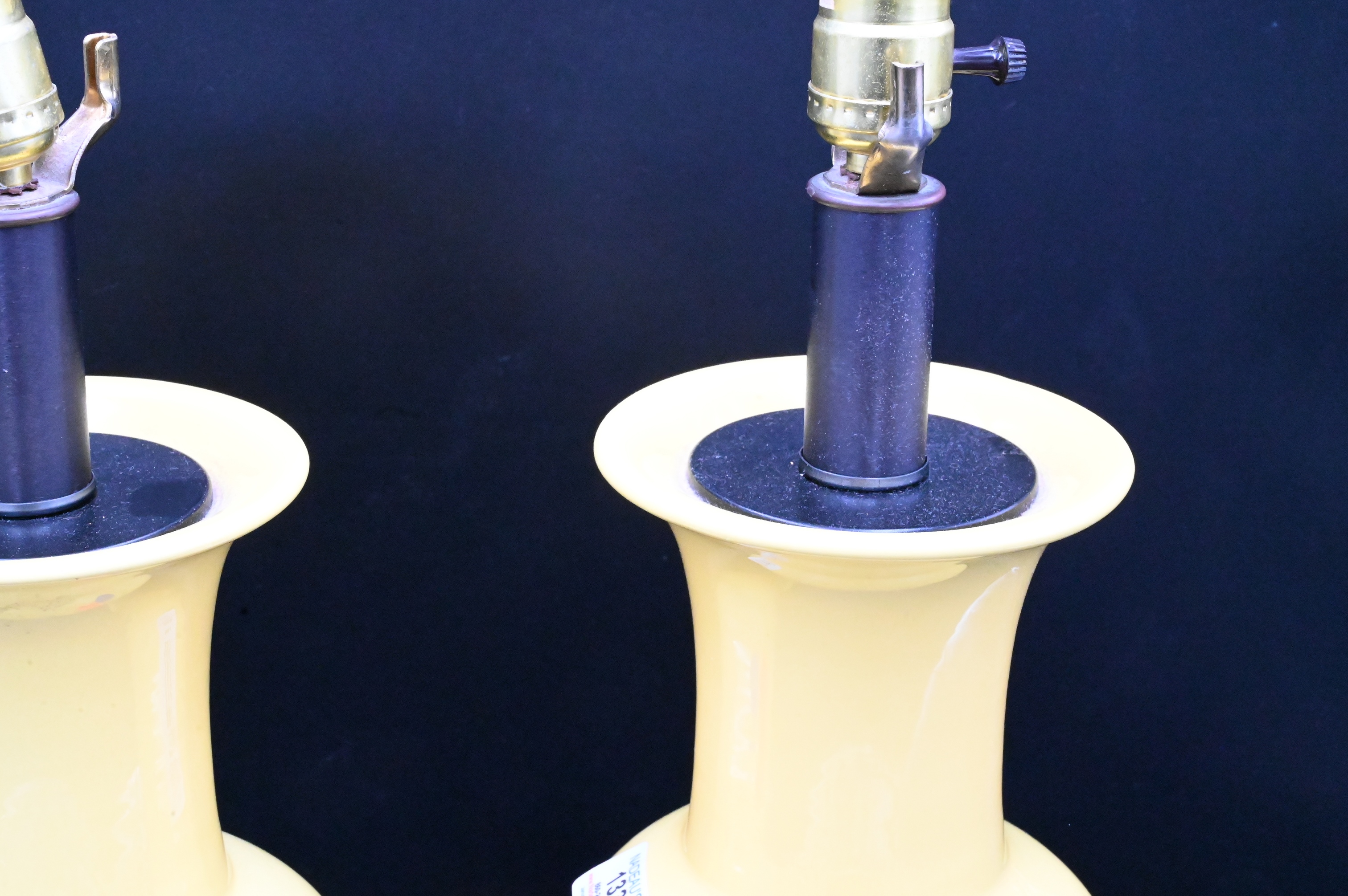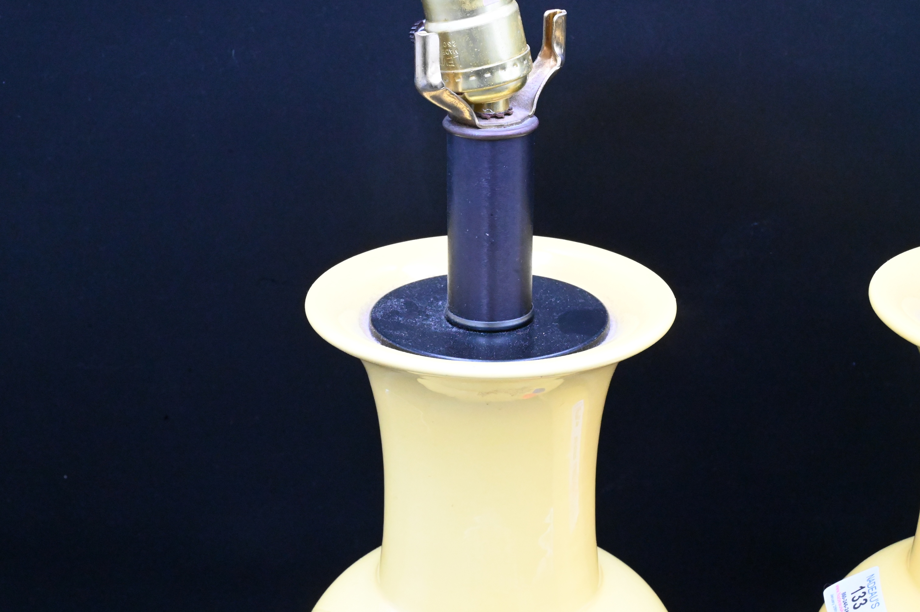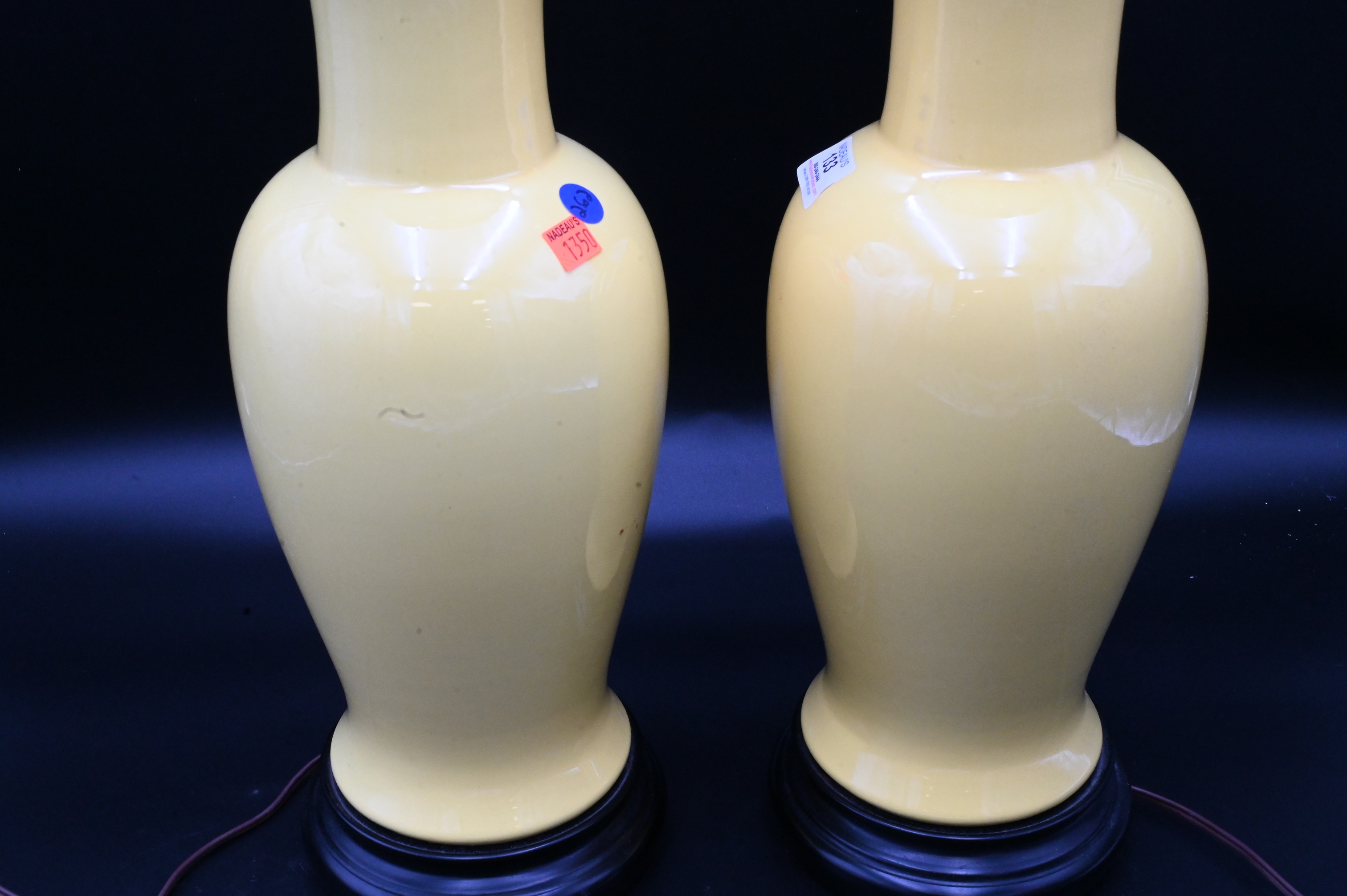 A Pair of Chinese Yellow Ground Baluster Vases, mounted as lamps, overall height 15 1/2 inches. Provenance: Property from a private New York collection sold to benefit charitable foundations.