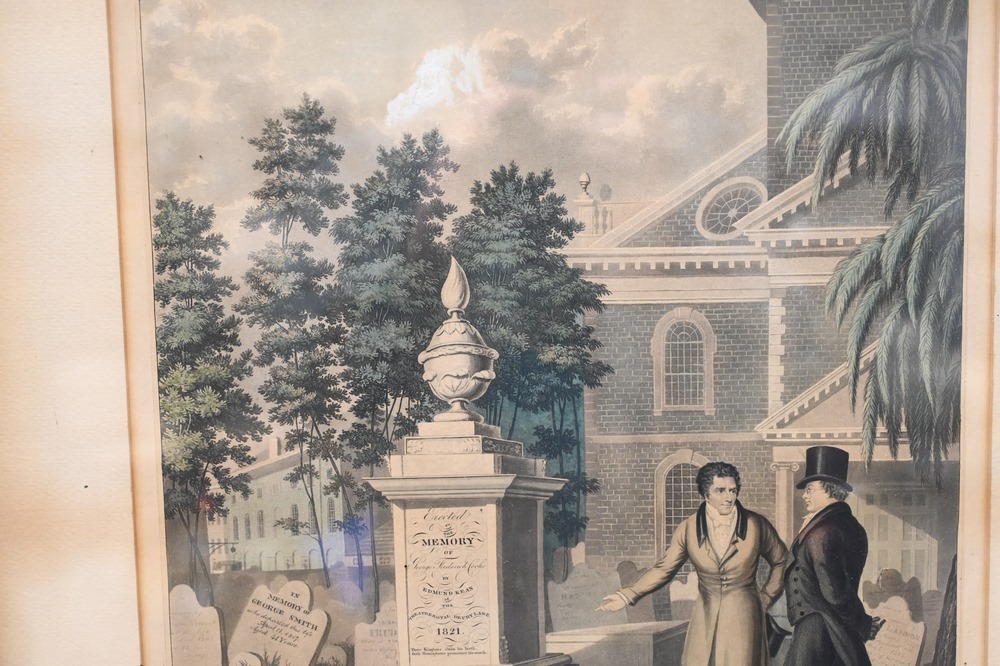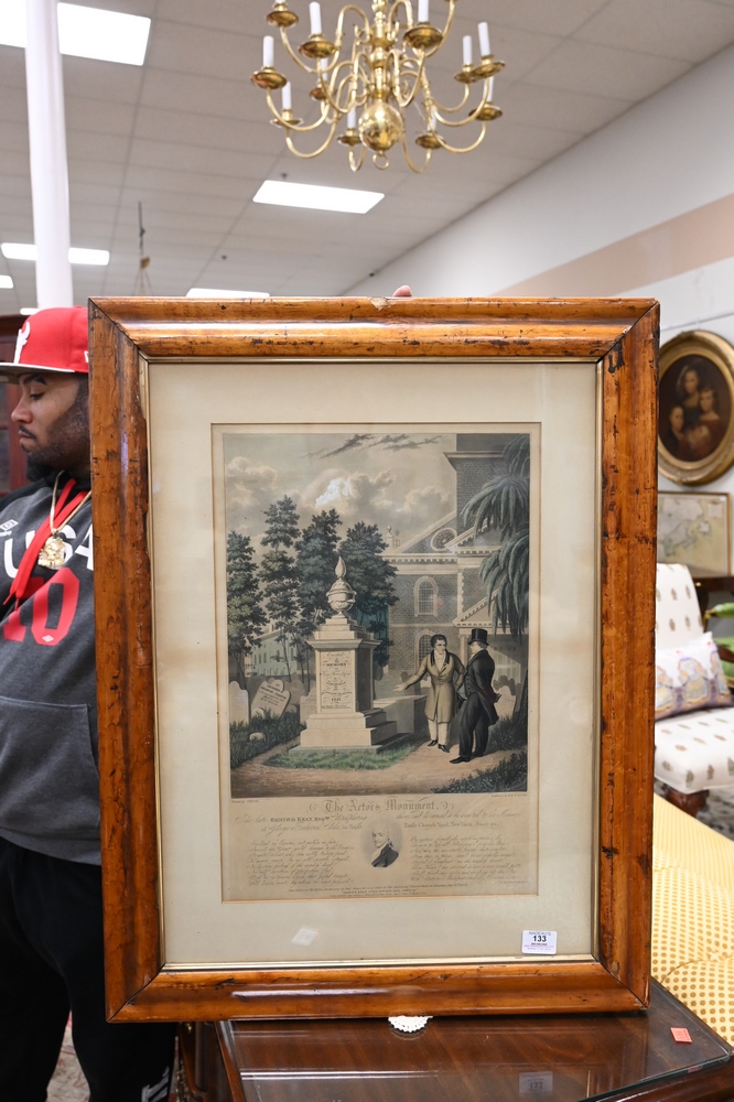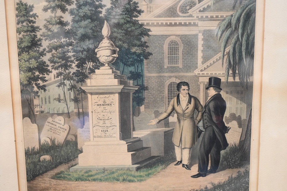 Lot 133: After John Rubens Smith, hand colored engraving by G & C Hunt, “The Actors Monument, the Late Edmund Kean, Esq. contemplating the tomb he caused to be erected to the memory of George Frederick Cooke in Saint Paul’s Church yard, New York, America, published by J. Moore, 1833, sight size 20 1/2 x 13 5/8 inches.