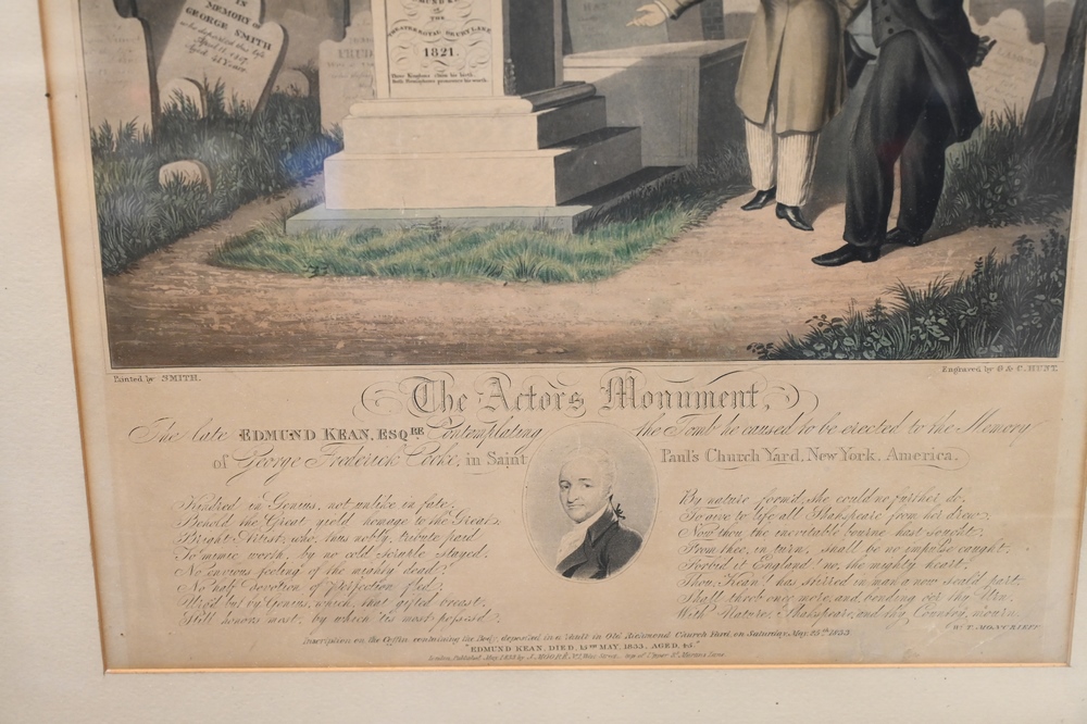After John Rubens Smith, hand colored engraving by G & C Hunt, “The Actors Monument, the Late Edmund Kean, Esq. contemplating the tomb he caused to be erected to the memory of George Frederick Cooke in Saint Paul’s Church yard, New York, America, published by J. Moore, 1833, sight size 20 1/2 x 13 5/8 inches.