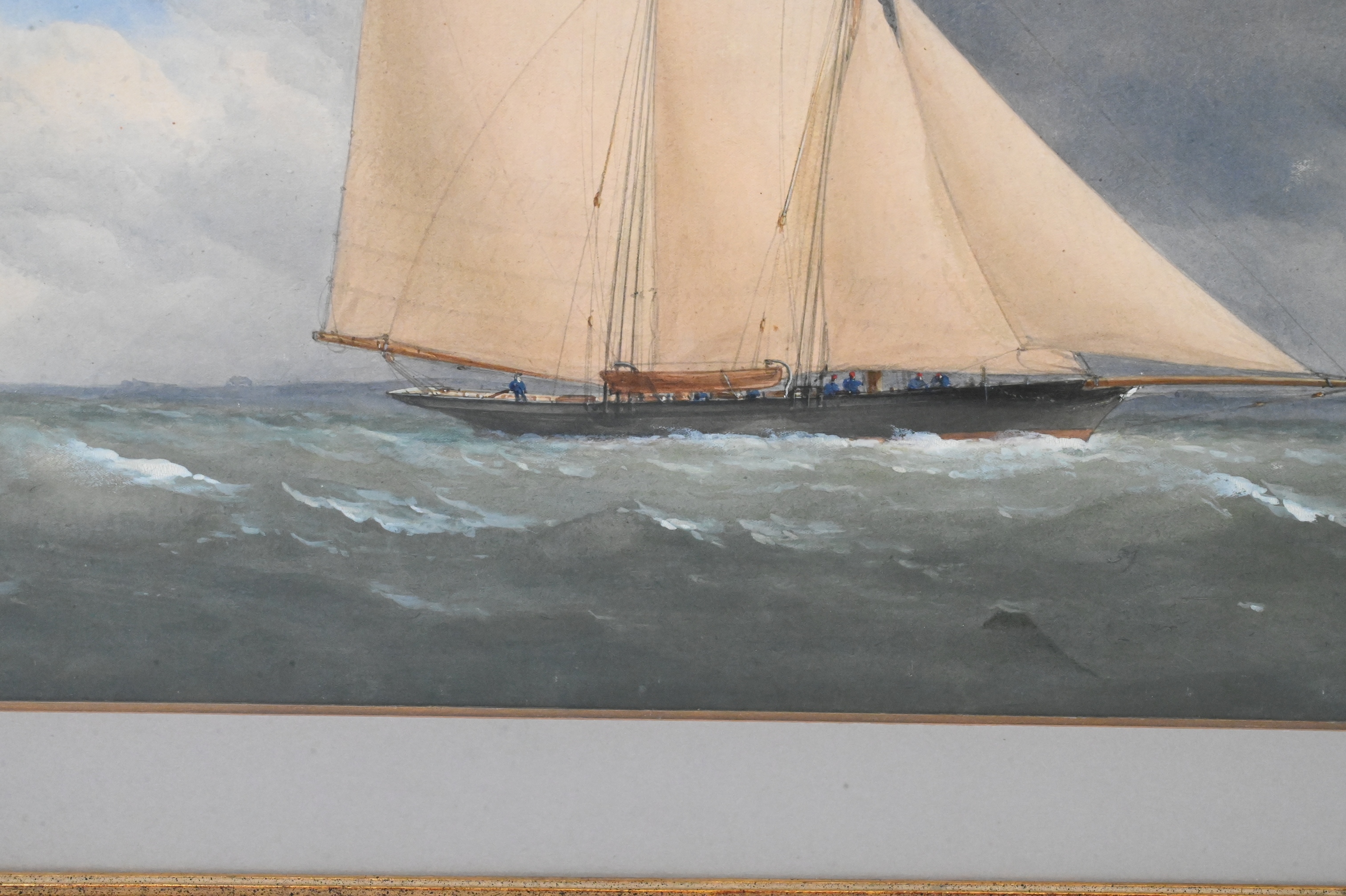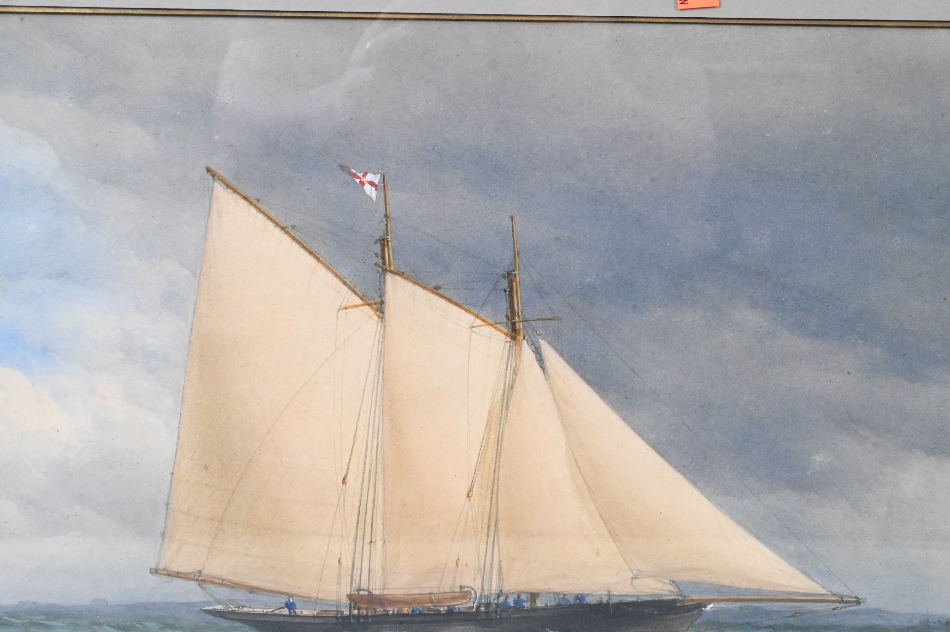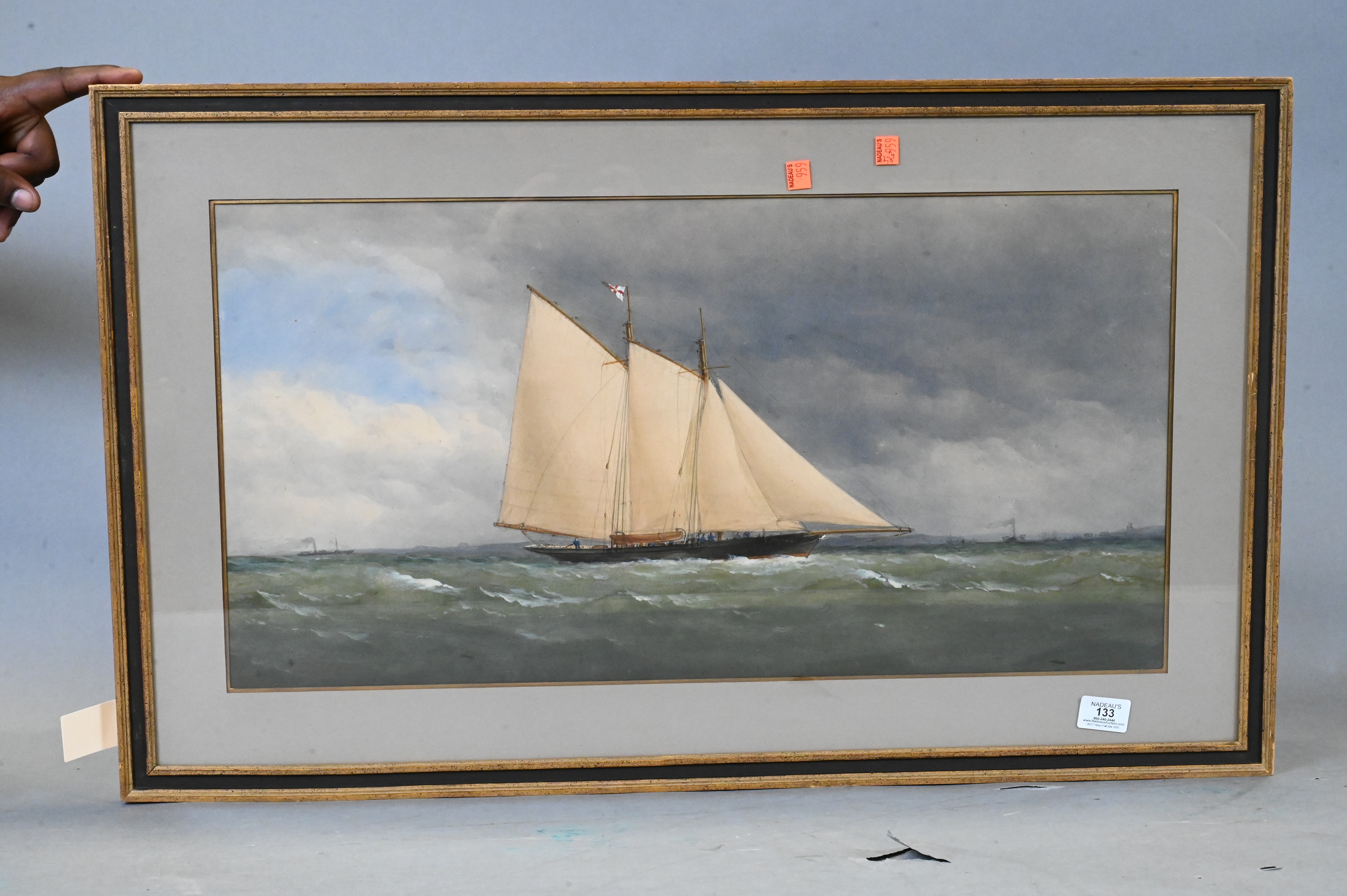 Depicting a schooner navigating through rough seas beneath a stormy sky, painted with atmospheric detail and fine rigging.