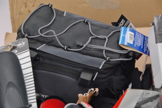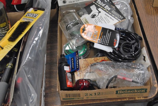 Commuter Biker lot to include Bell Helmet, three pairs of gloves, rain jacket, lock Avenir bag, miscellaneous lights, mirror, handle bar tape, lube, dual side frames, approximate retail price 300.00