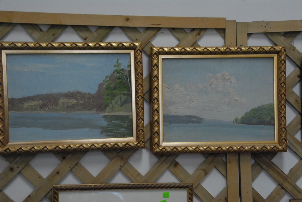 Five piece lot: three Academic Old Master engravings signed Bernard Picart Died 1733 For Les Postures Innocents Published Posthumously 1738, 10 x 7 and pair of oil on board paintings, Cloud’s in the Sky, unsigned, 11 x 15.