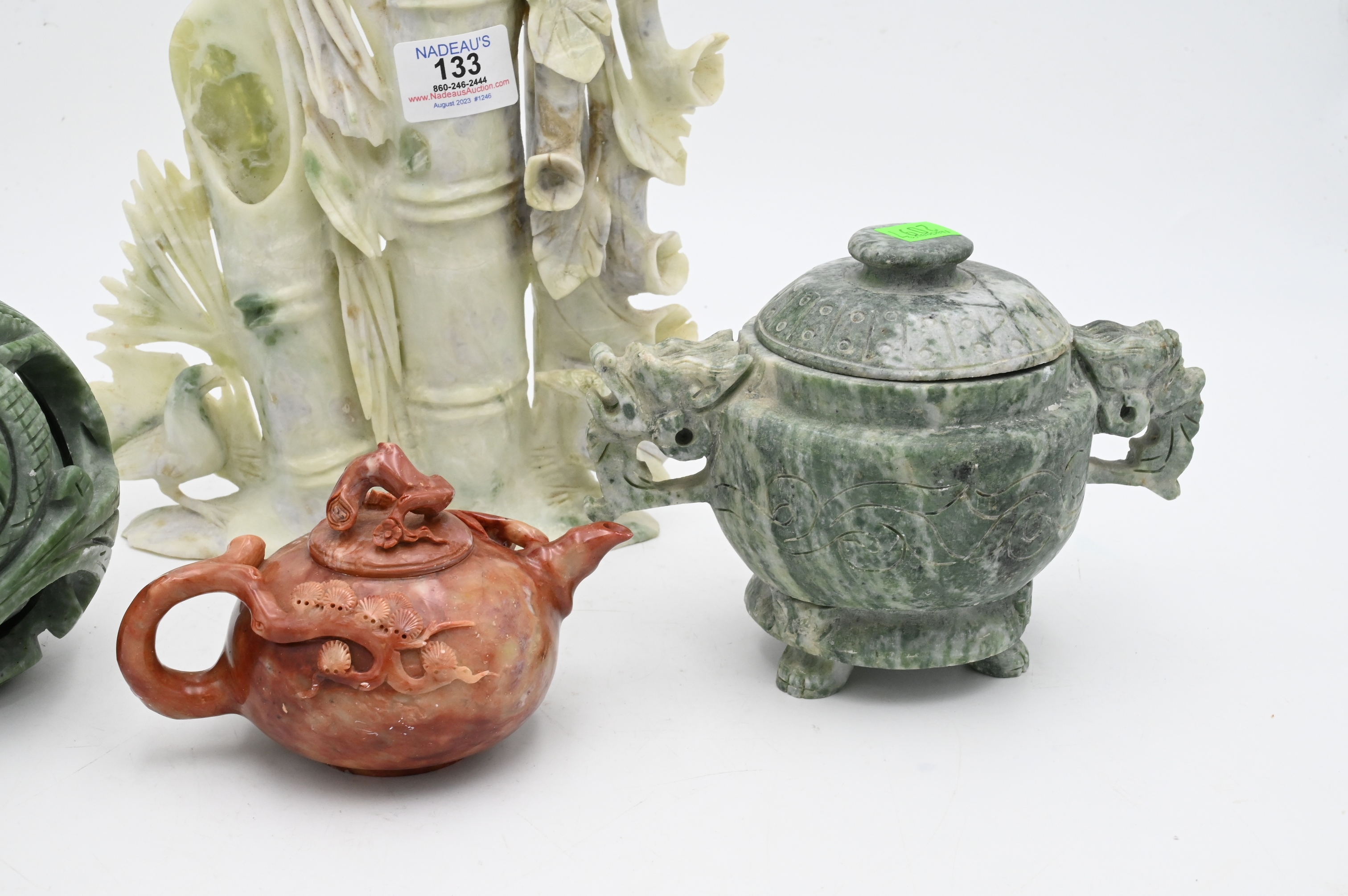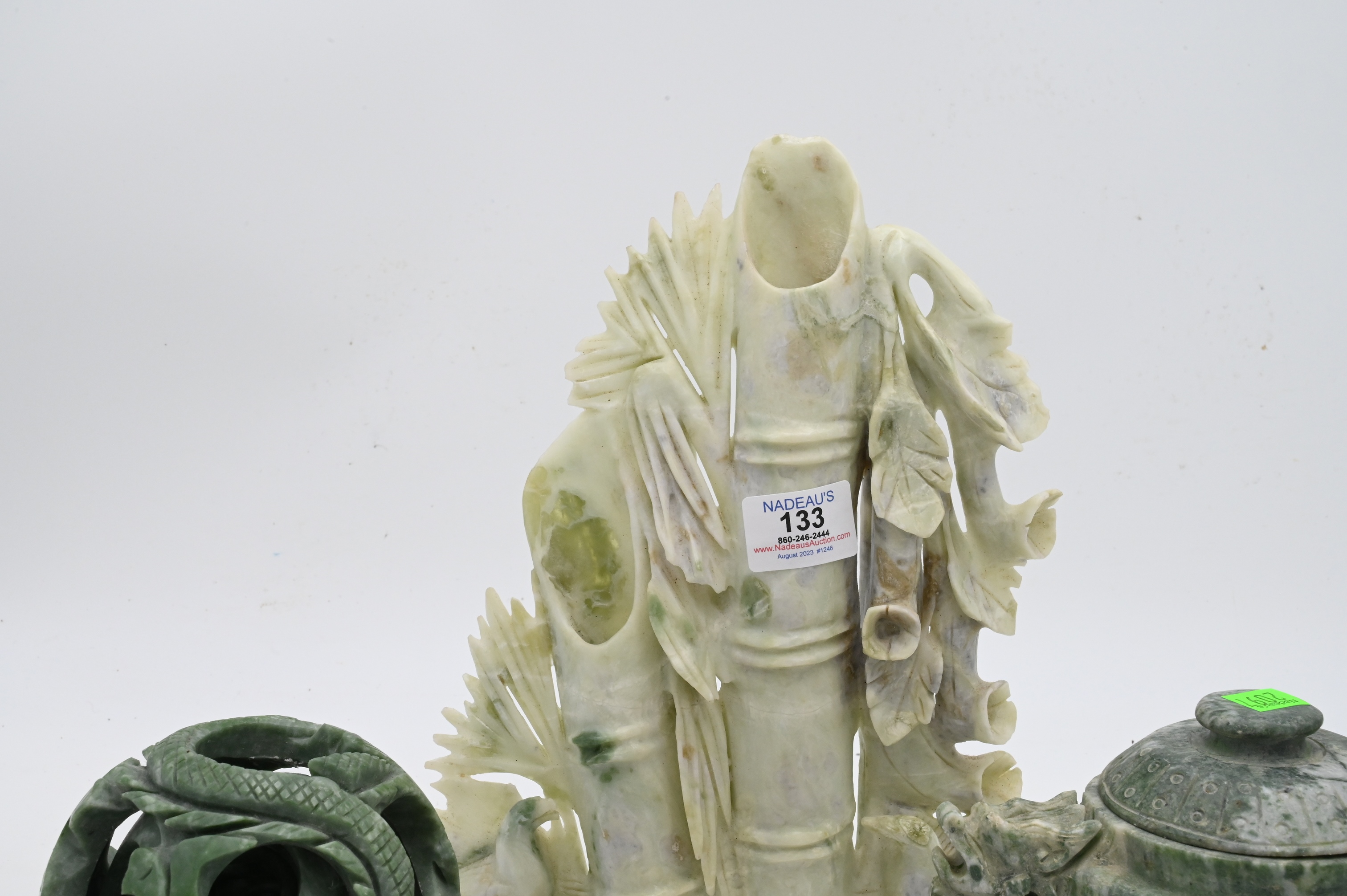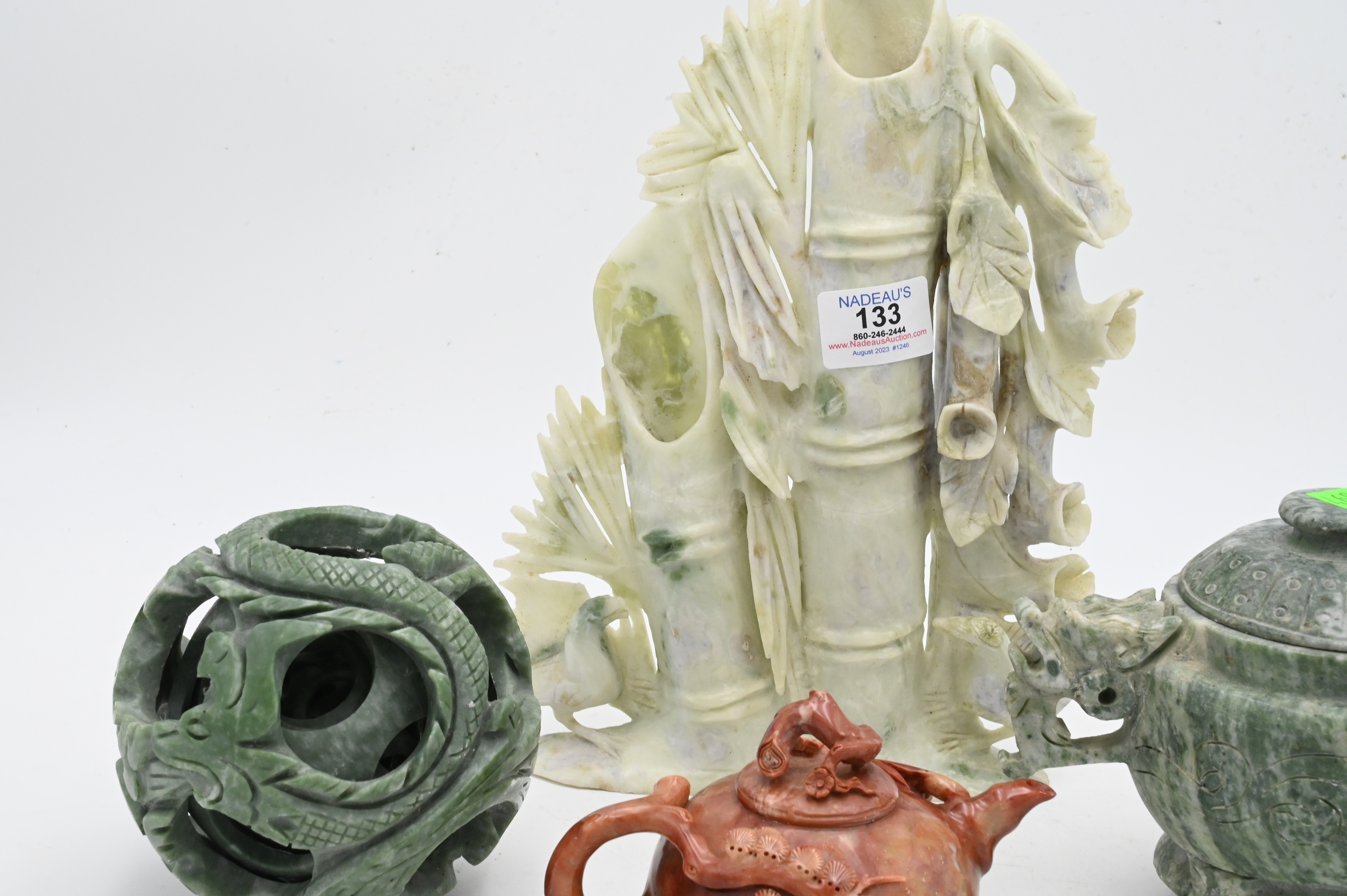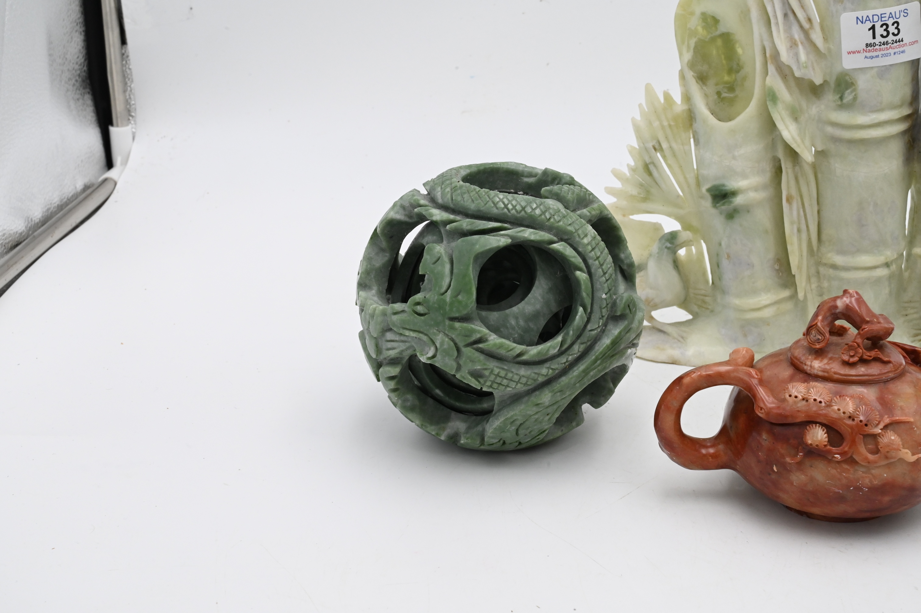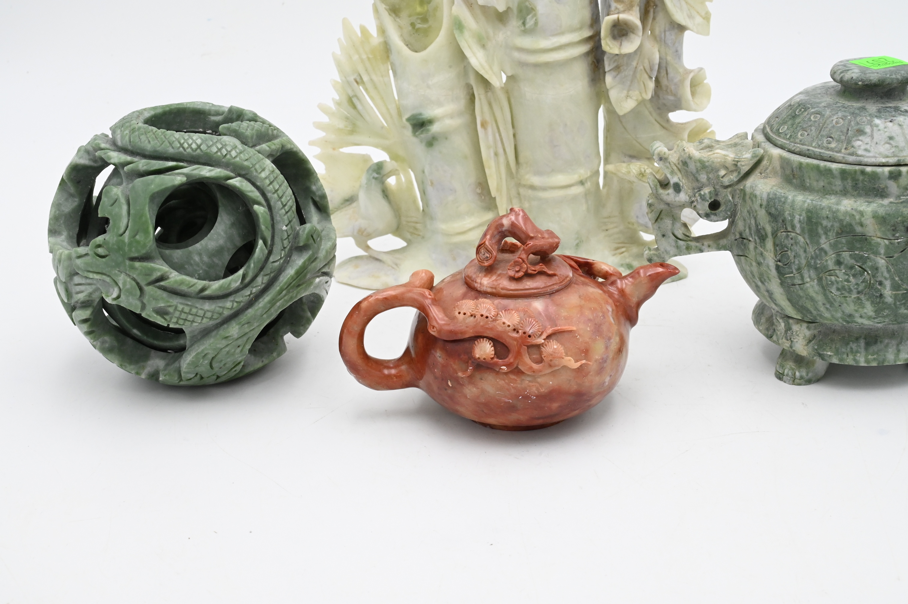 Four Piece Hardstone Lot, to include multi layered vintage puzzle ball, two teapots, along with a carved bamboo and bird sculpture, carved bamboo height 12 inches.