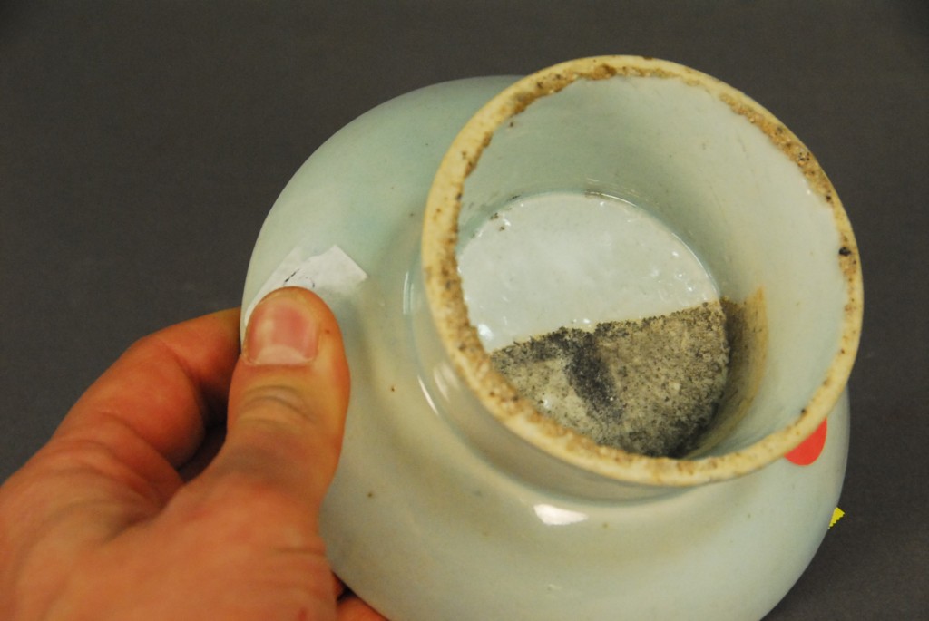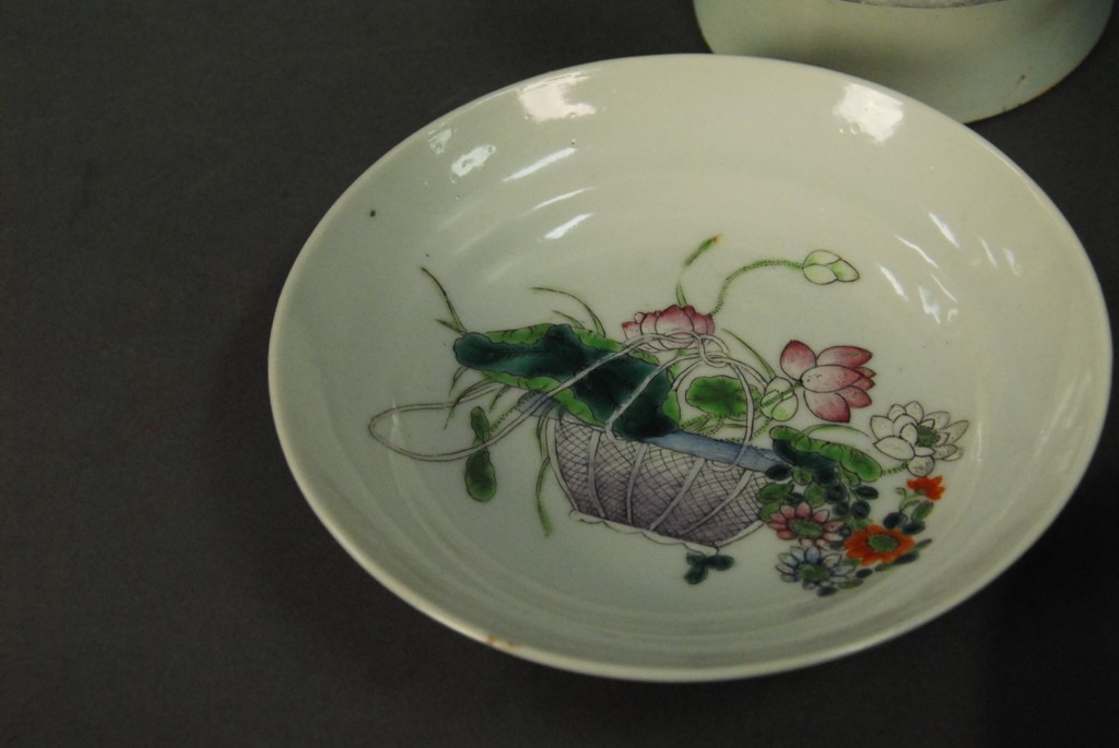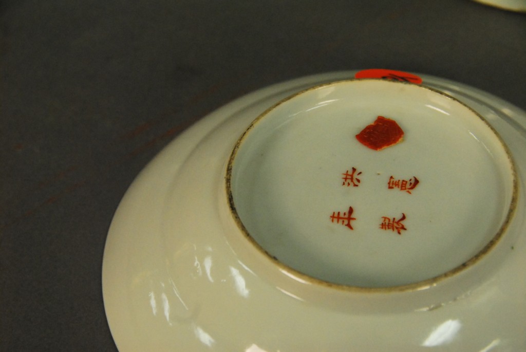 Lot 133: Group of four items to include, a pair of Rose Famille plates and a pair of porcelain stem plates, dia. 5 1/2.