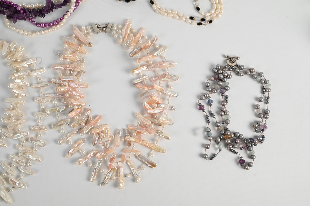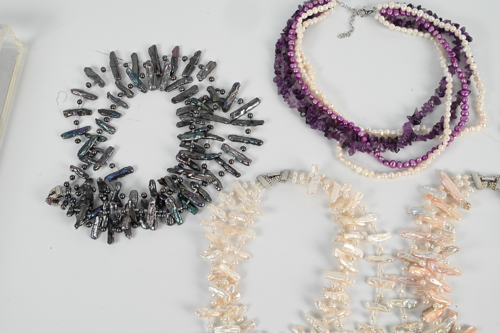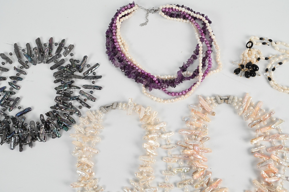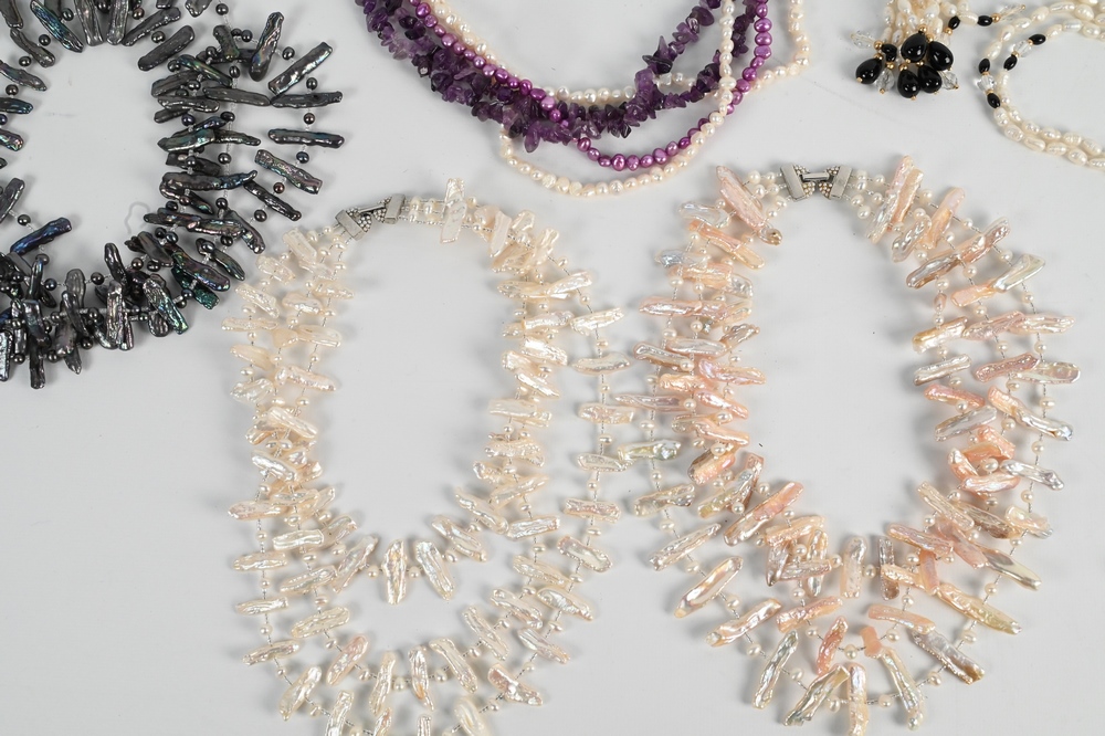 Group of Six Necklaces, to include pearl single strand having black and gold beads, three branch form pearl necklaces, a pearl and purple glass four strand necklace, along with a multiple strand necklace having pearl and purple quartz.