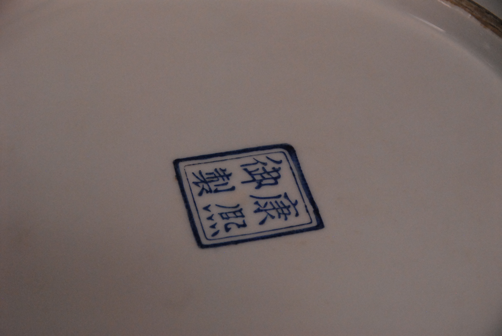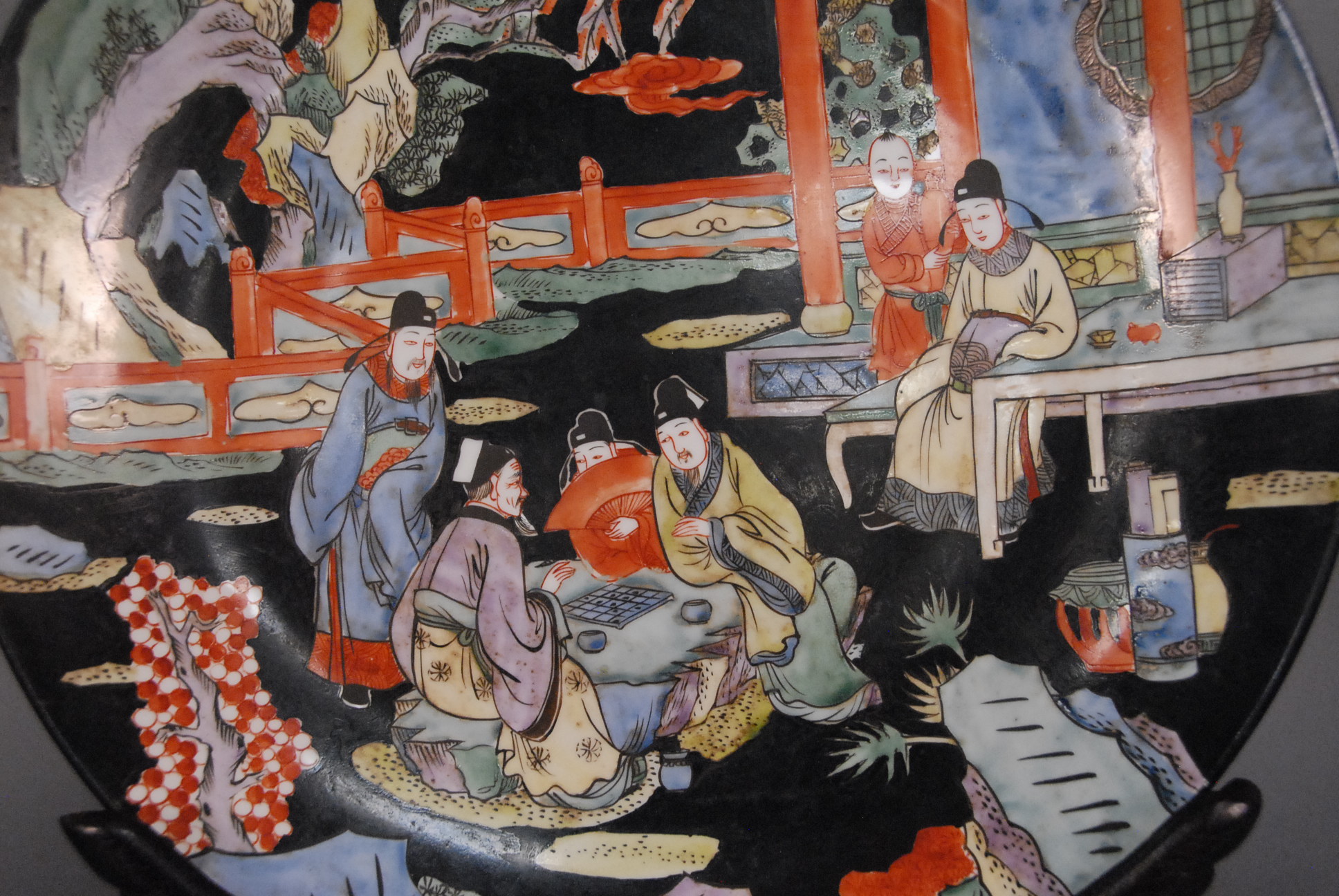 Large Oriental charger having courtyard scene with figures, dia. 18in.