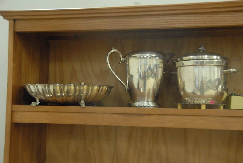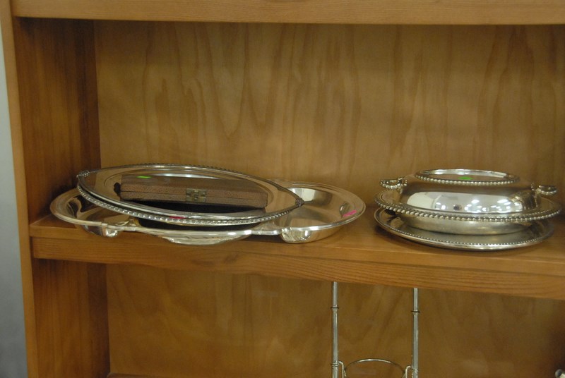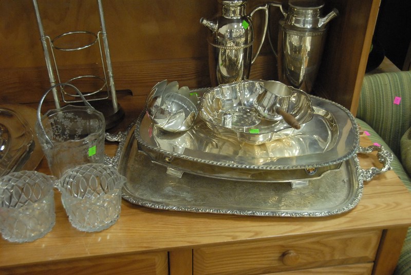 Lot 133: Large silverplate lot including warming dish, several platters, bowls, ice bucket, enameled demitasse spoons, etc.
