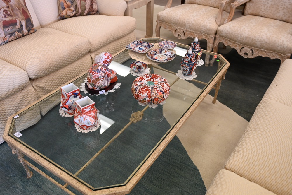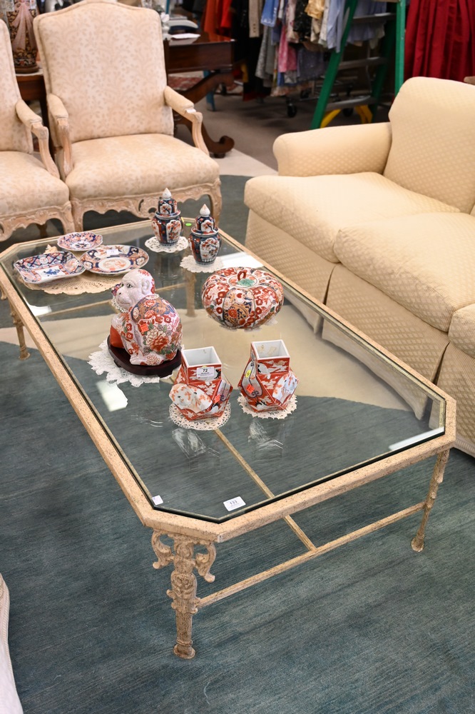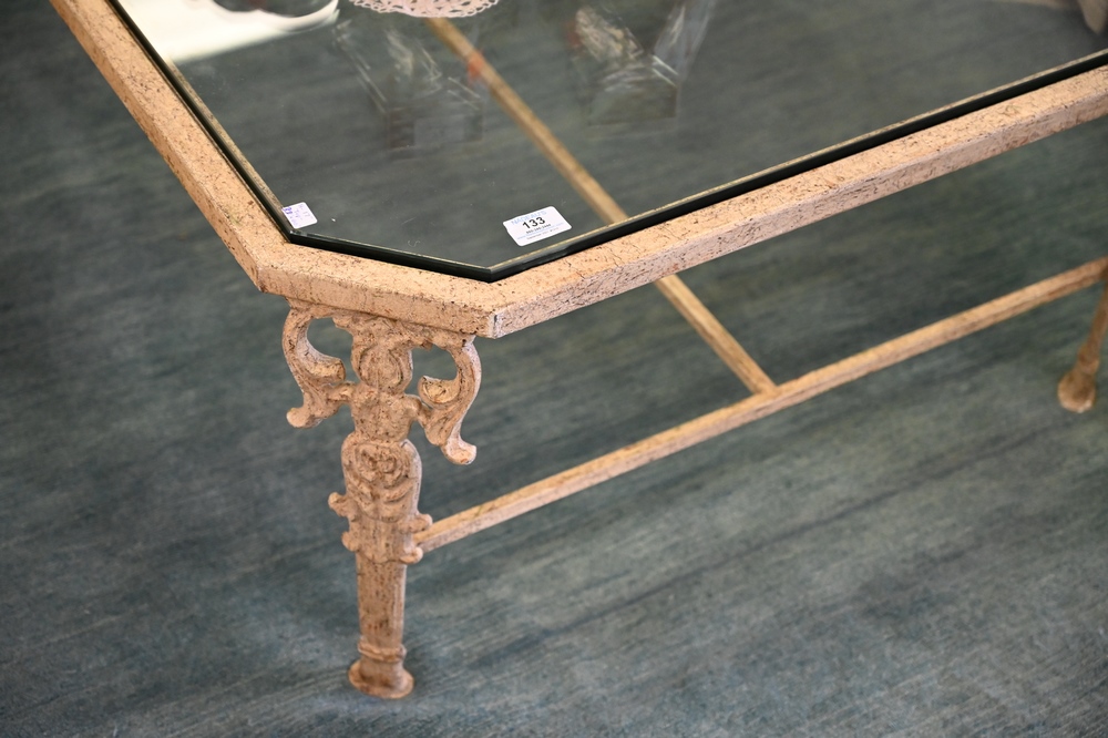 Lot 133: Minton Spidell Iron and Glass Coffee Table, having eight sides, height 17 inches, top 32″ x 60″.