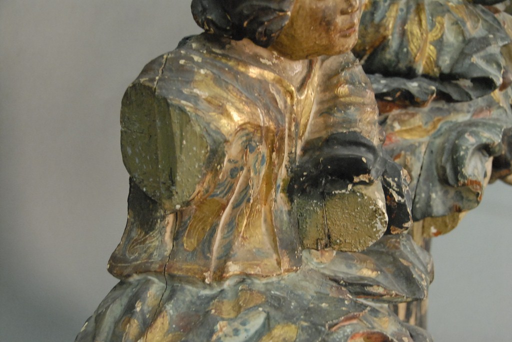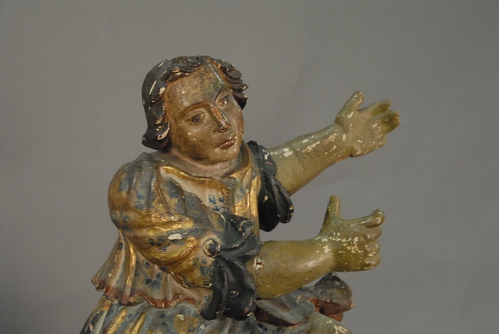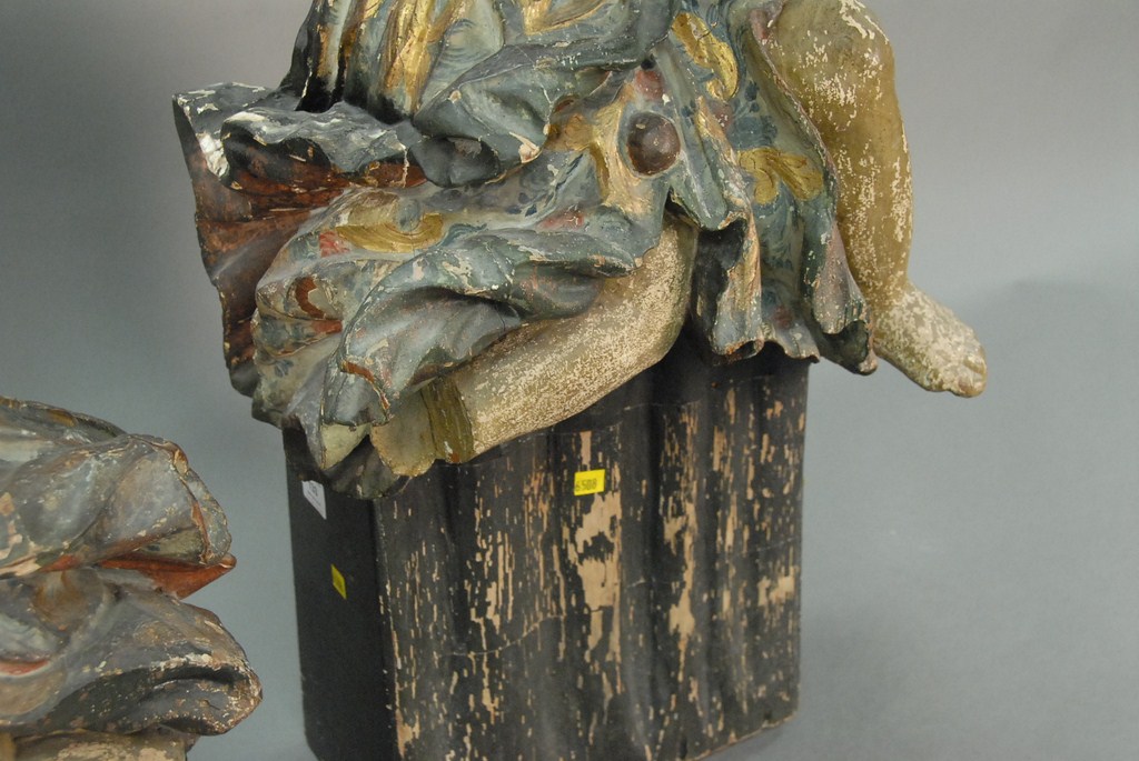 Pair of carved and gessoed Venetian figures, each in original paint with gilt highlights and flowing dresses, both seated on wood stands, probably 18th century or earlier one arm and one hand missing. Provenance: property from a home in Rockville Center, New York which was decorated by Iris Apfel. ht. 29in. & ht. 32in.