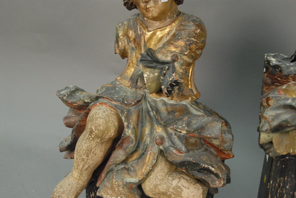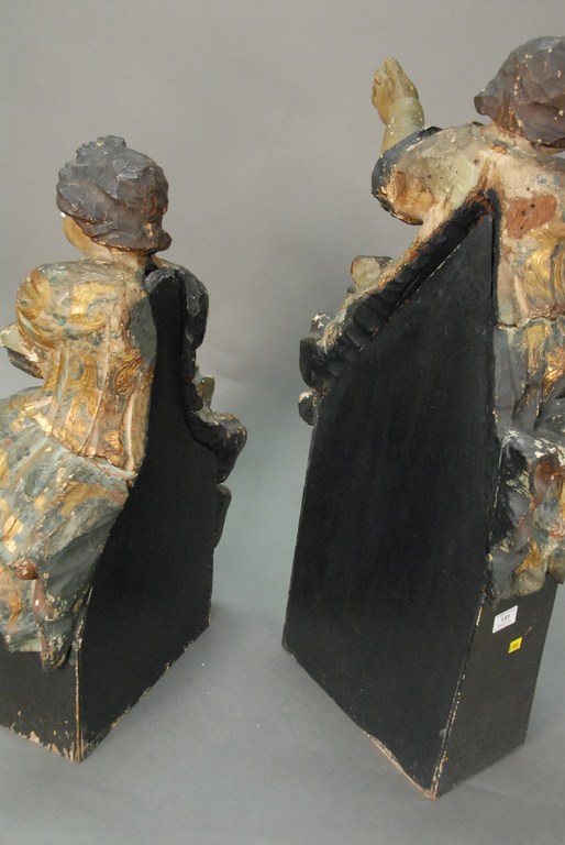 Lot 133: Pair of carved and gessoed Venetian figures, each in original paint with gilt highlights and flowing dresses, both seated on wood st…