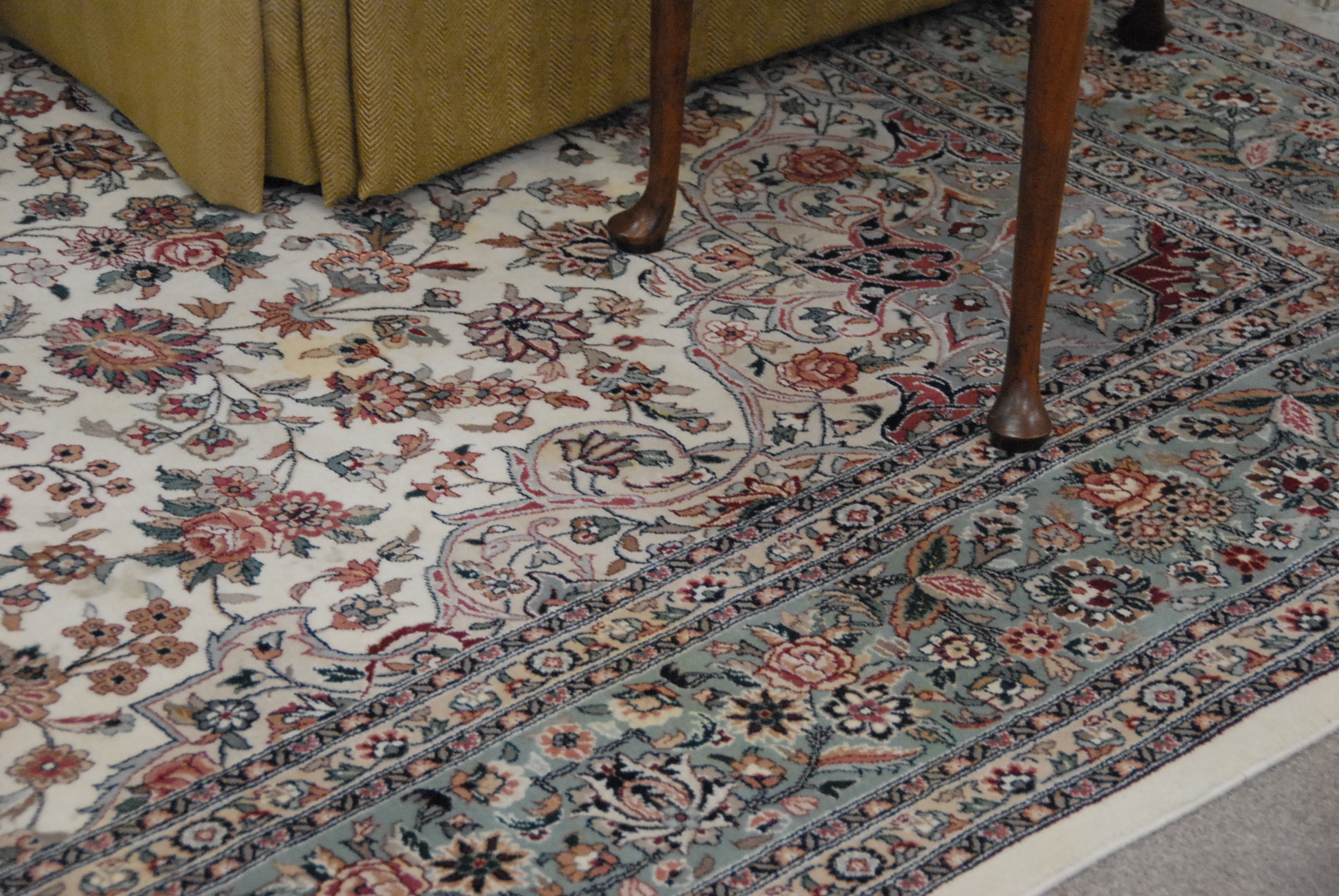 Room size blue and white Oriental rug, 9’2 x 12’2.