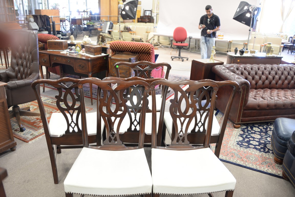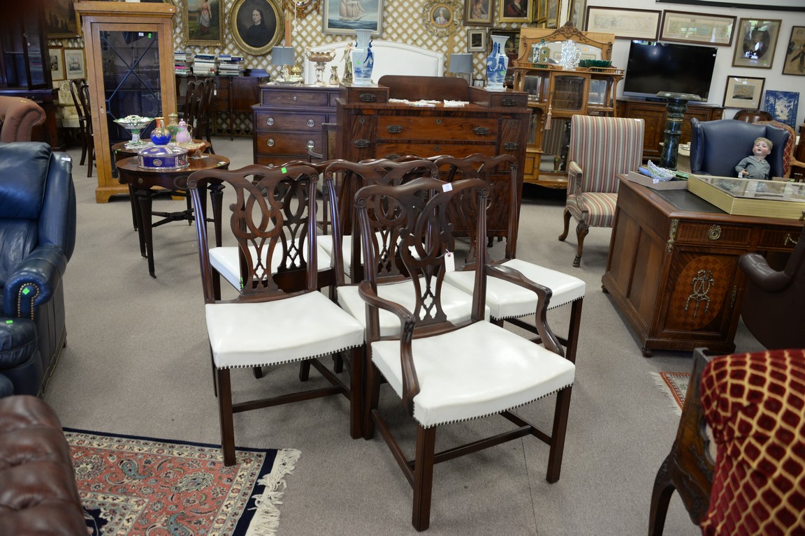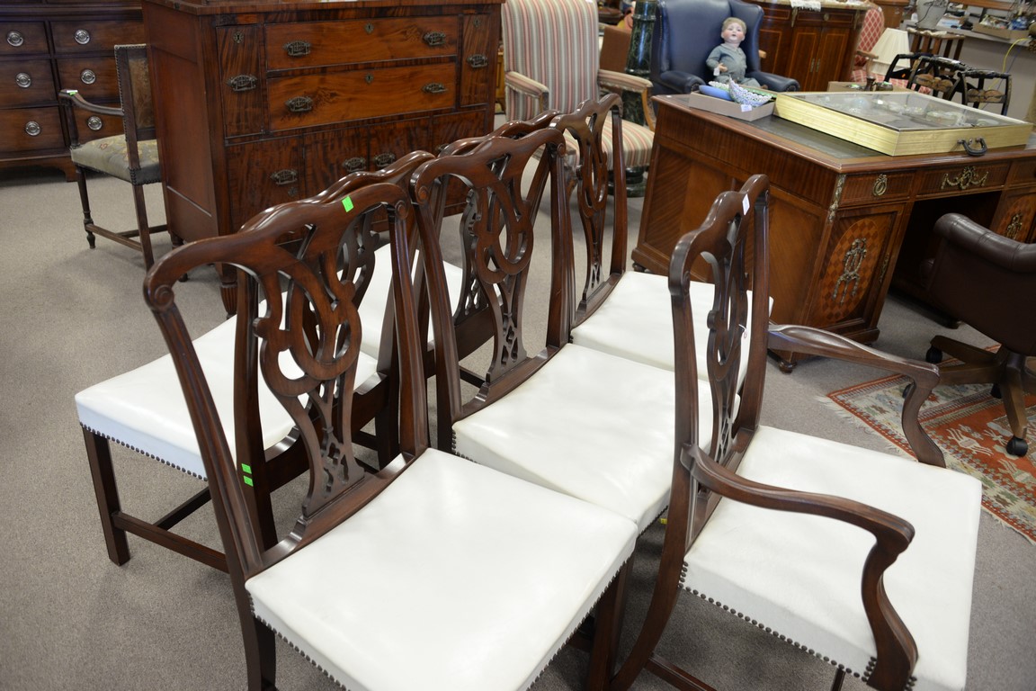 Set of six Grand Lodge mahogany Chippendale style chairs with white leather seats.