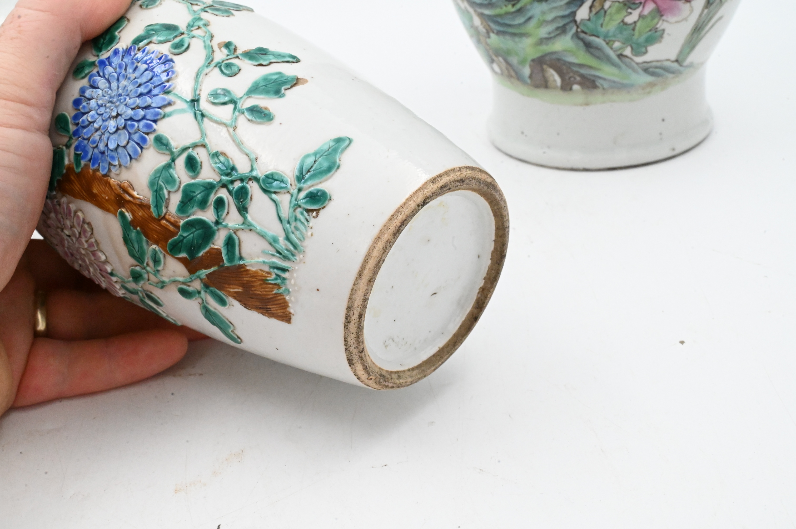 vase having enamel crane, peonies and tree motif, smaller flared rim vase with high relief enamel chrysanthemum and butterfly design along with jar having antiquities and flower motif, character marks to underside