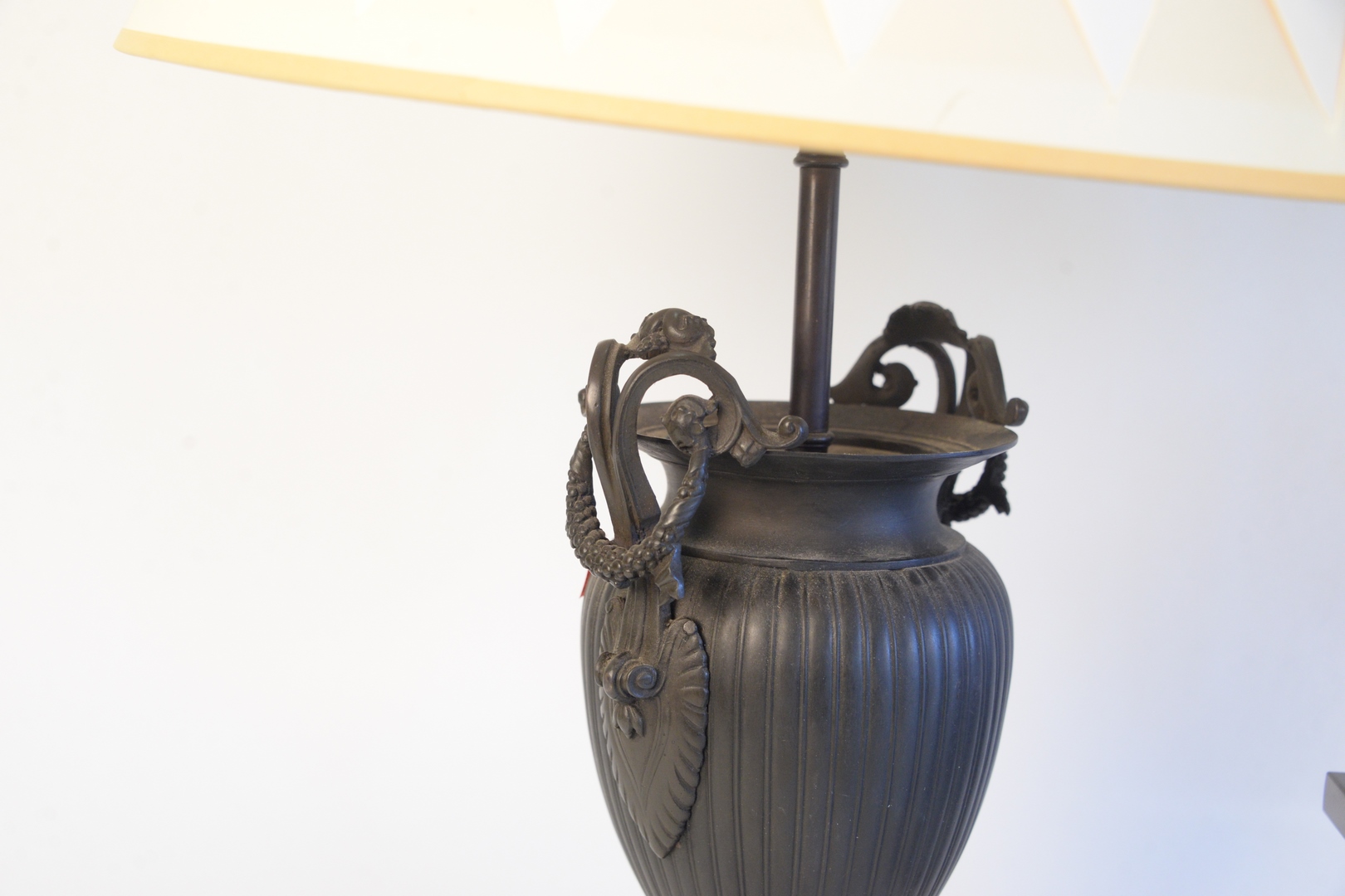 Lot 133: Three Piece Group, to include a pair of bronze urns with wreath handles, made into table lamps, height 12 1/2 inches along with a r…