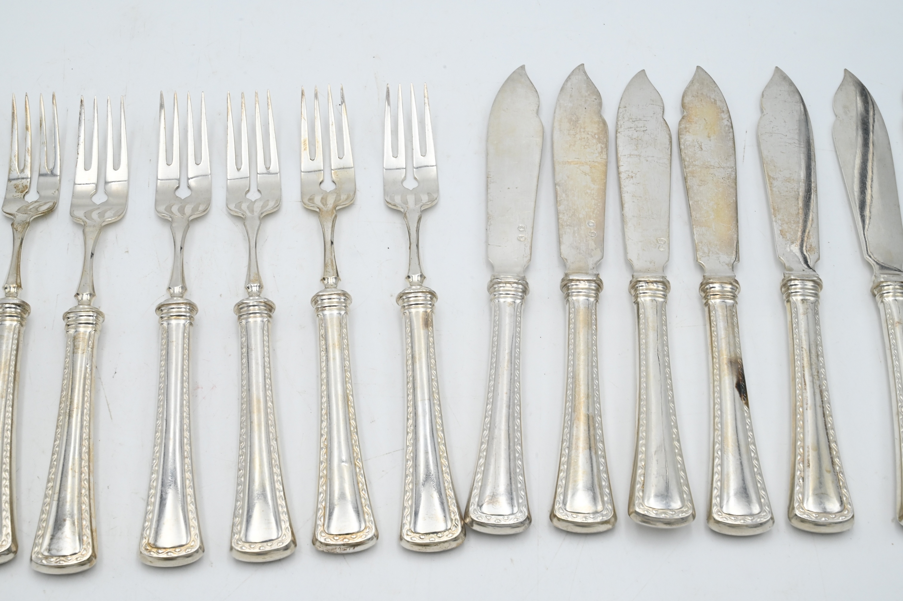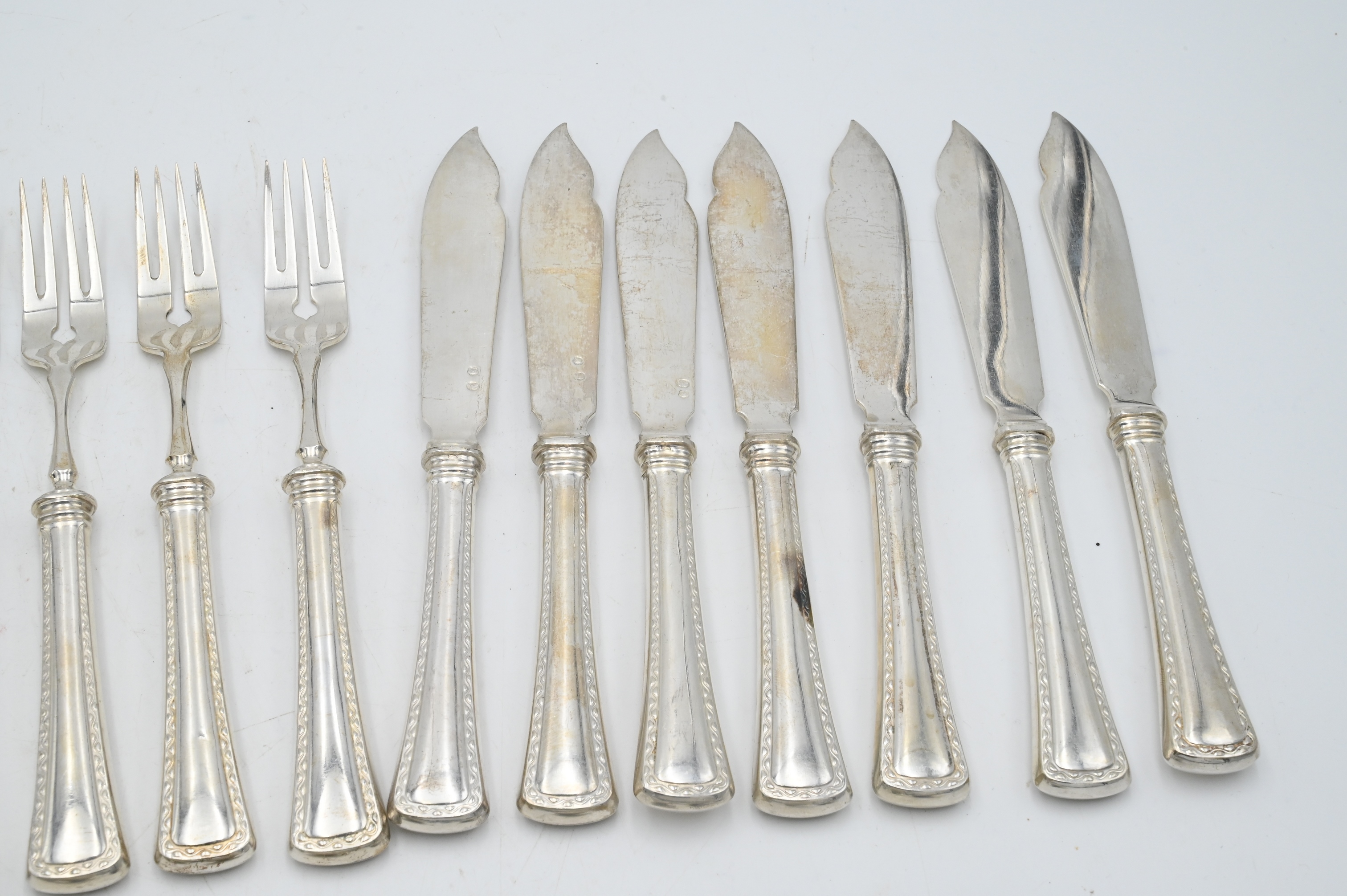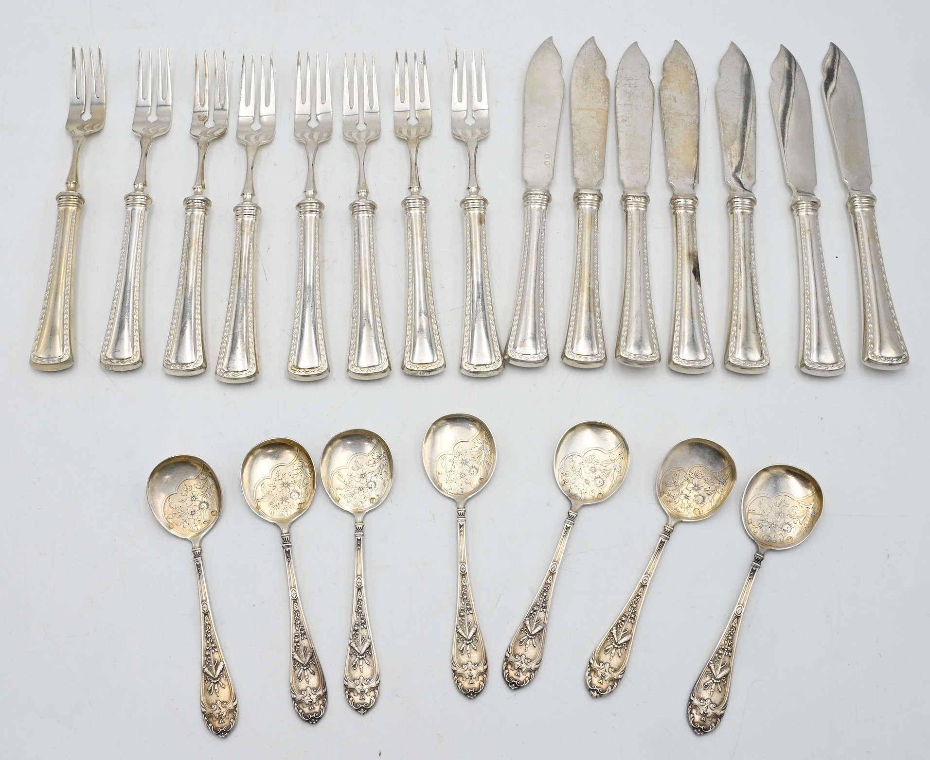14 Piece 800 Silver Fish Set, comprised of 7 fish forks, 7 fish knives, together with 7 French 950 silver spoons, 28.02 t.oz. total weight.