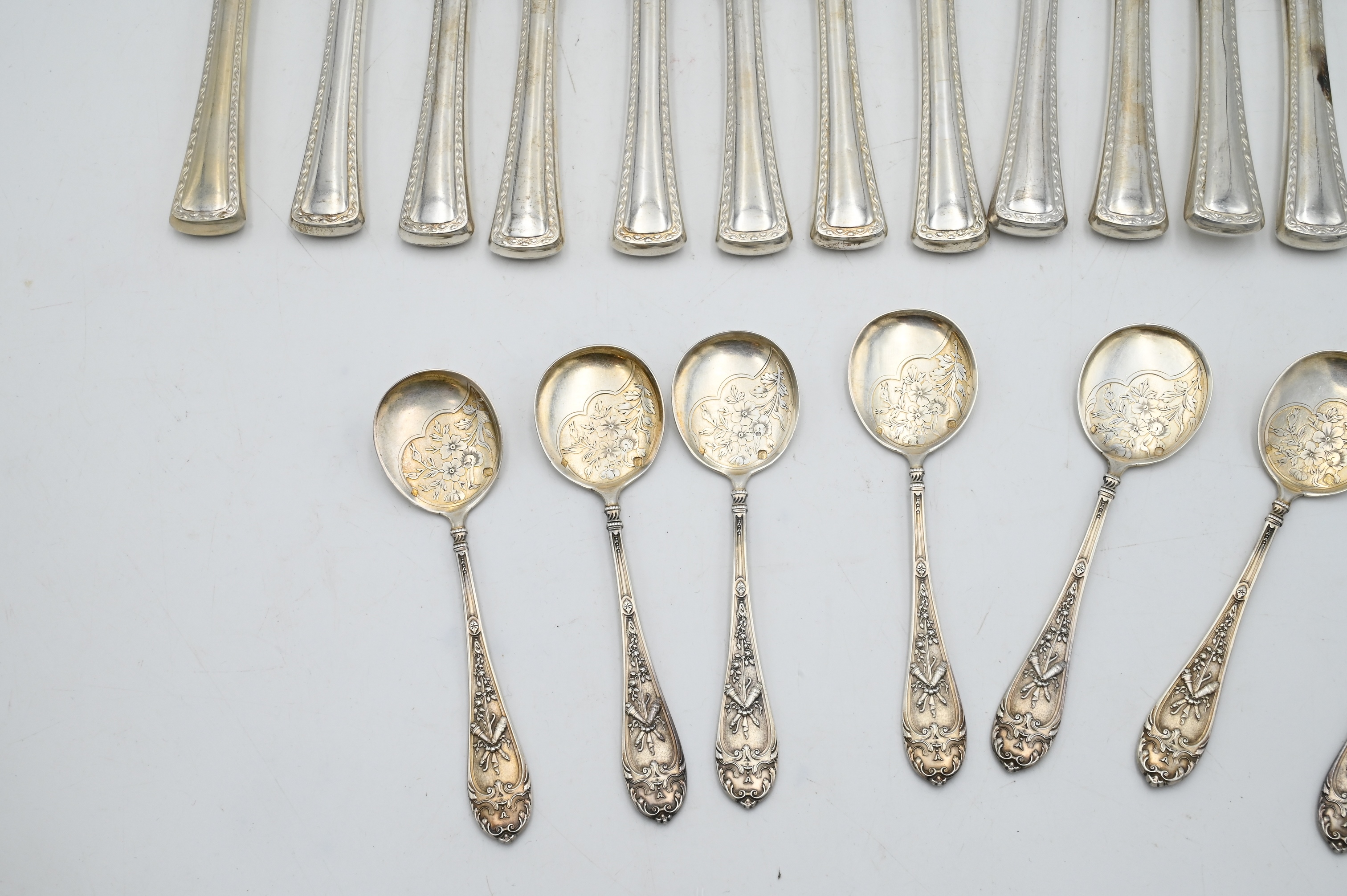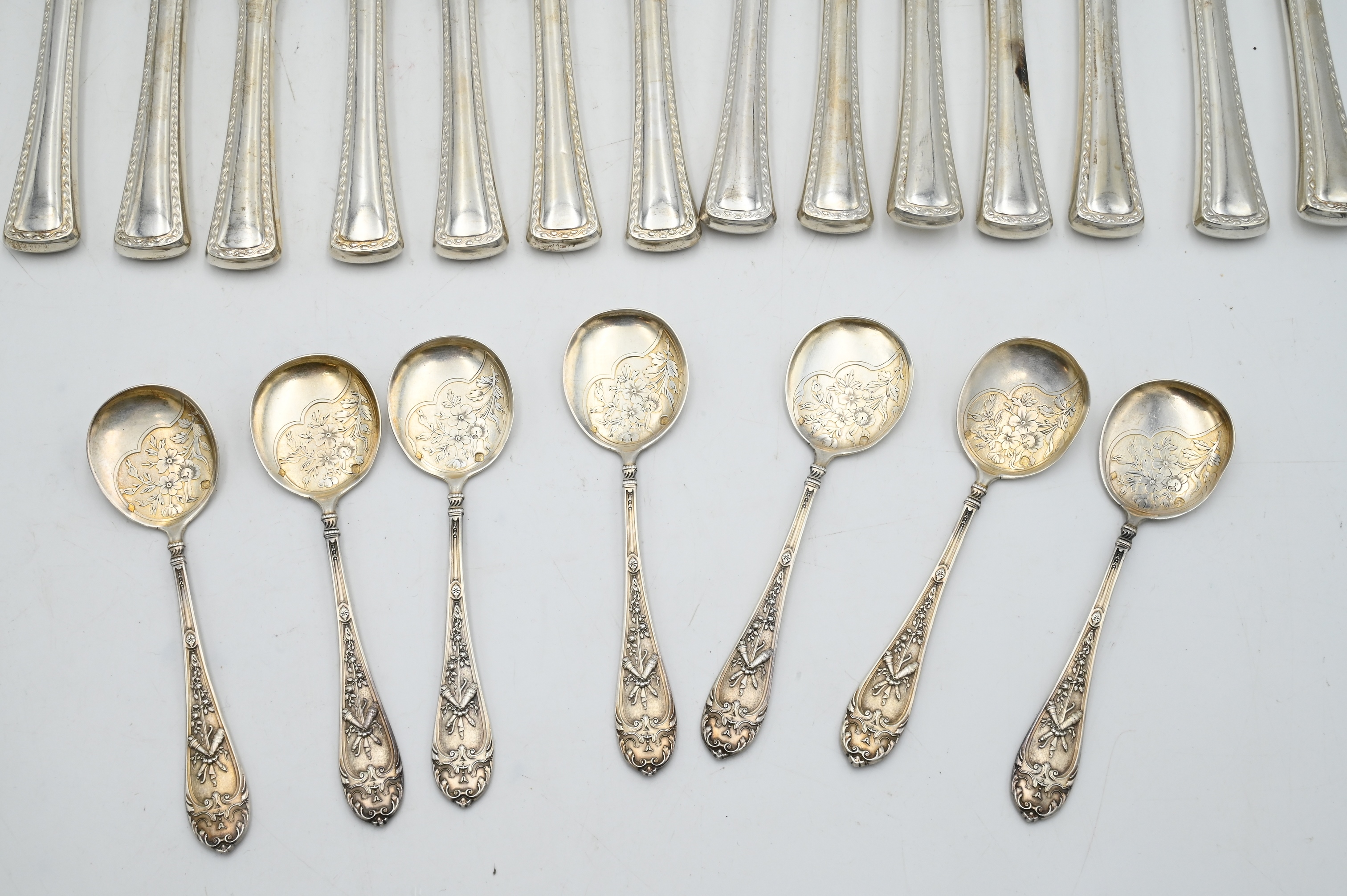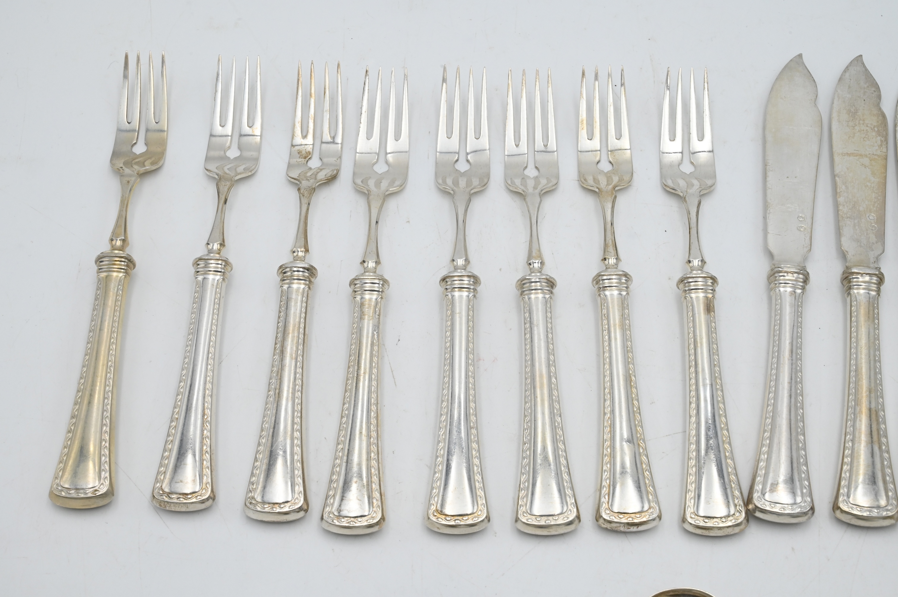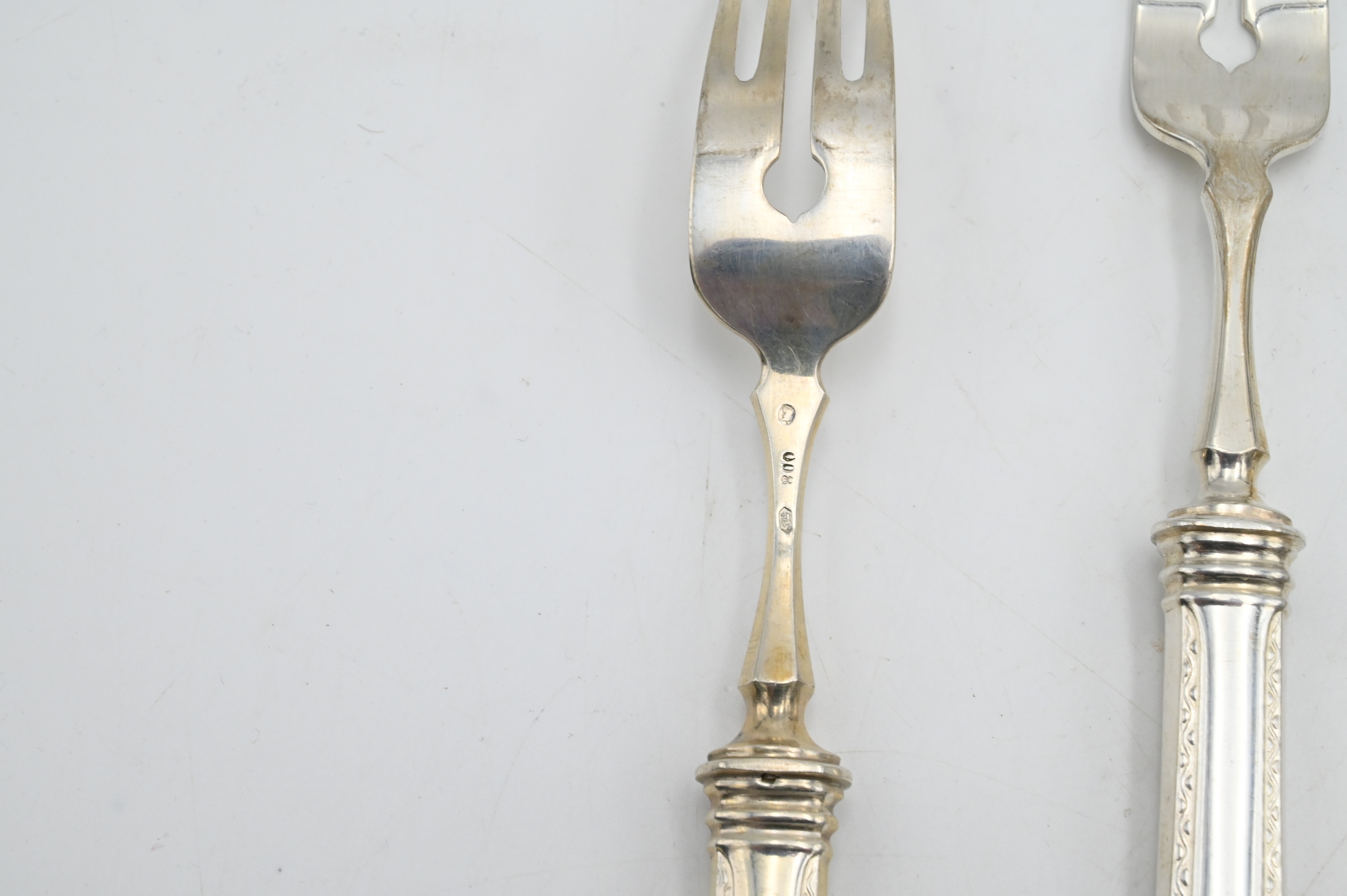 14 Piece 800 Silver Fish Set, comprised of 7 fish forks, 7 fish knives, together with 7 French 950 silver spoons, 28.02 t.oz. total weight.