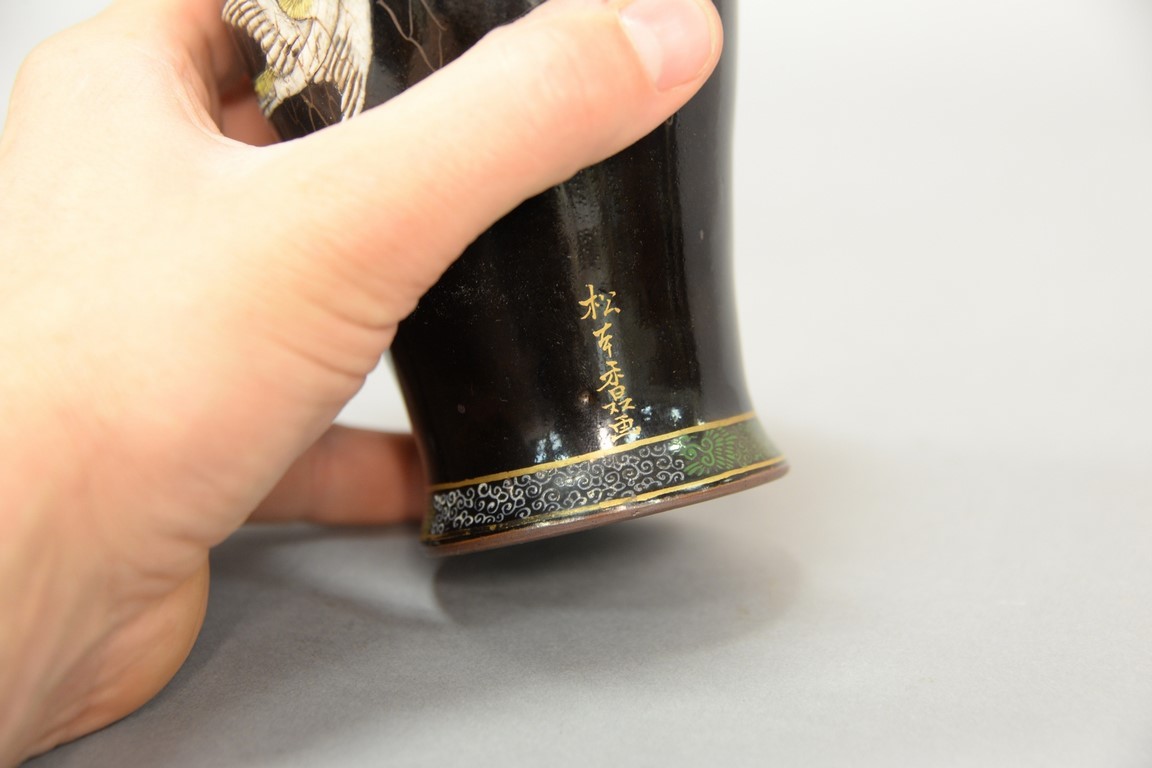 Earthenware Oriental vase, background with heavy enameled painted birds, signed on side and having two seal marks on bottom. ht. 6 3/4in.