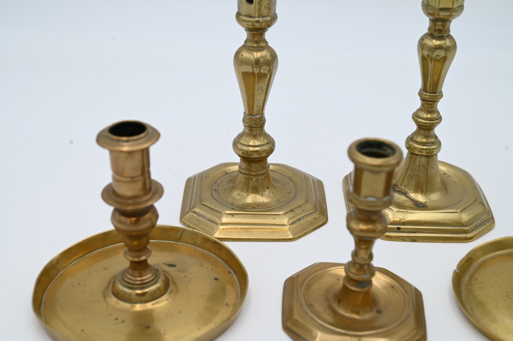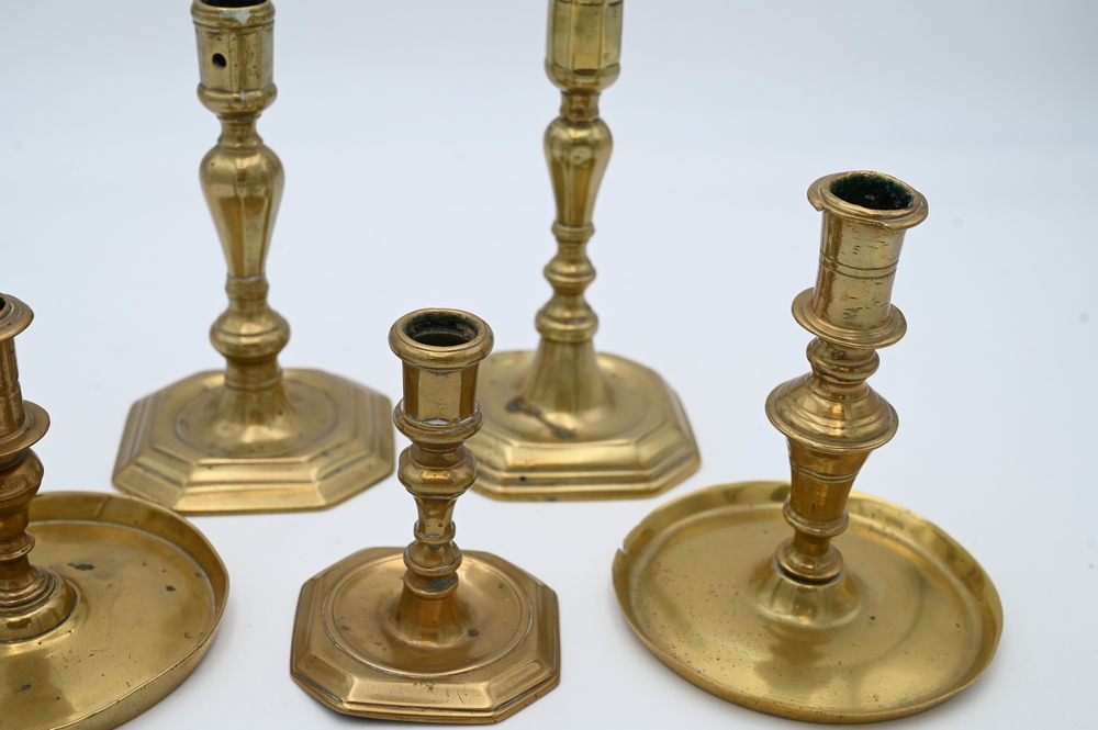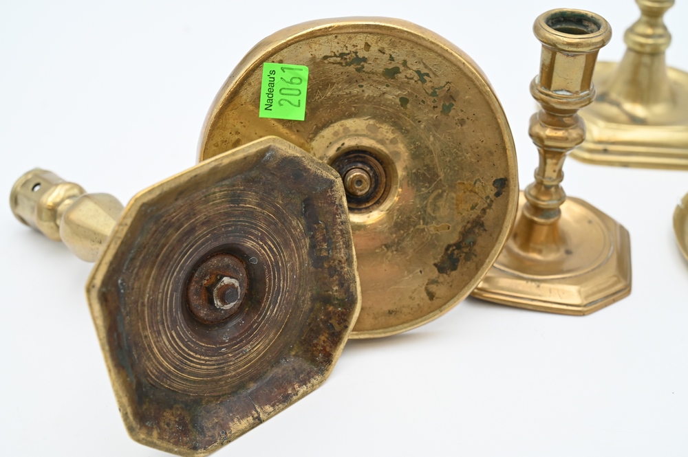 Five Early Brass Candlesticks, tallest 7 1/2 inches.