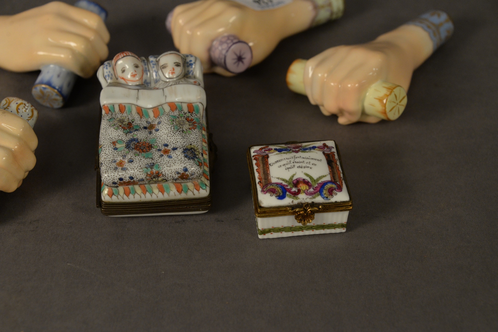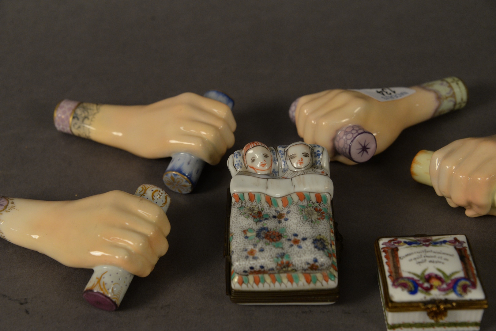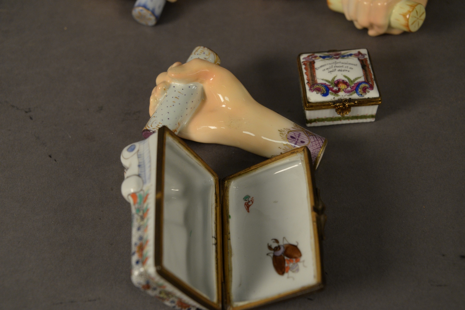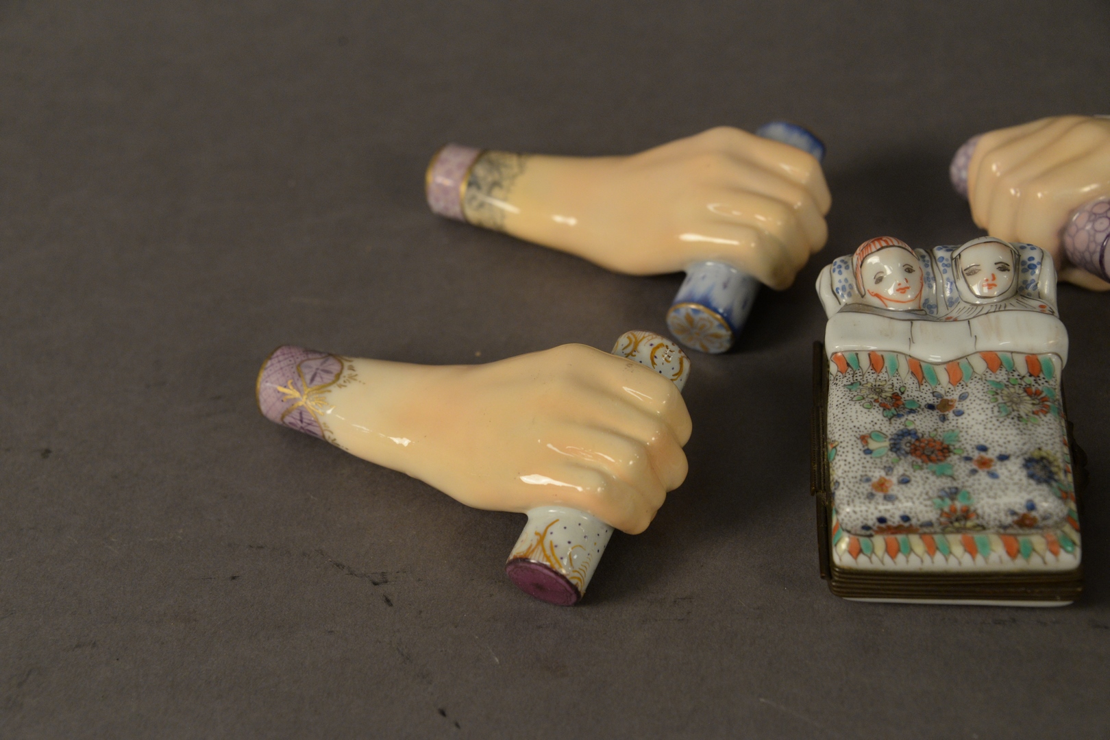 Group of Five Porcelain Items, to include a box in the form of two figures in a bed small square box along with four porcelain hands, hand-painted holding a box, possibly etui or cane top, length 4 1/2 inches.