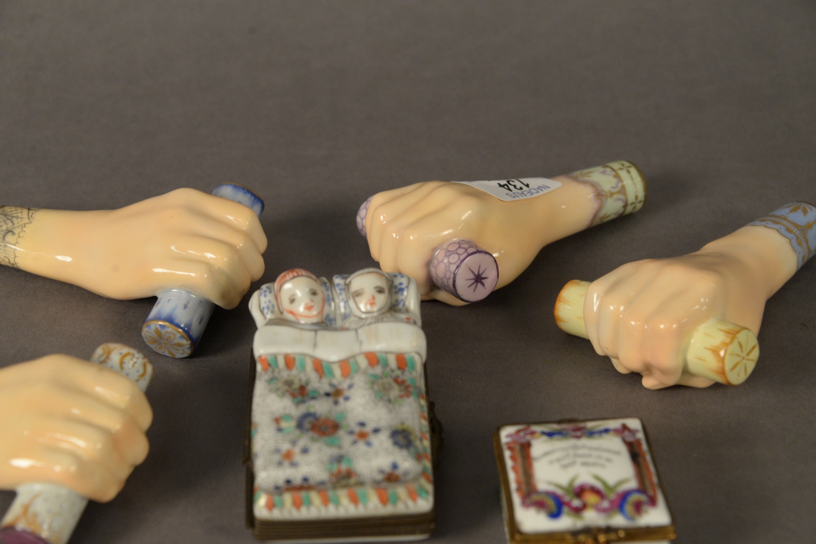 Lot 134: Group of Five Porcelain Items, to include a box in the form of two figures in a bed small square box along with four porcelain hands, hand-painted holding a box, possibly etui or cane top, length 4 1/2 inches.