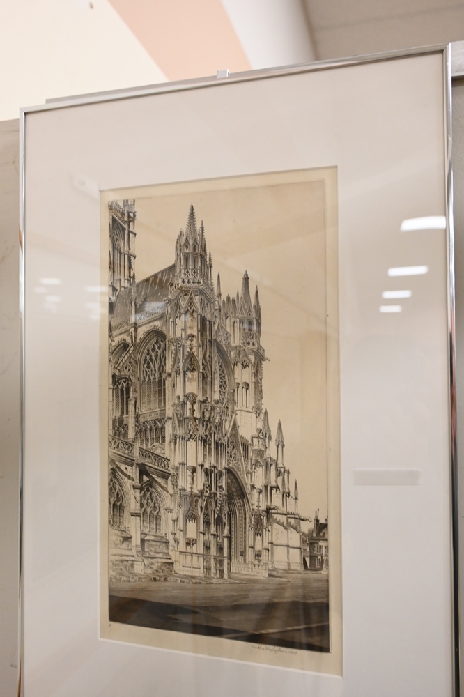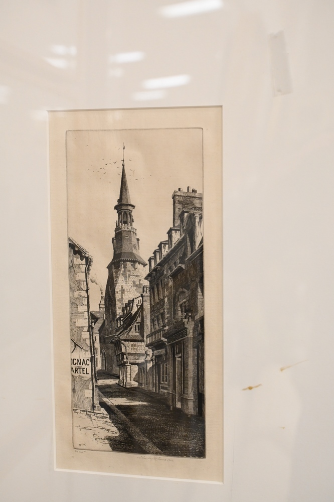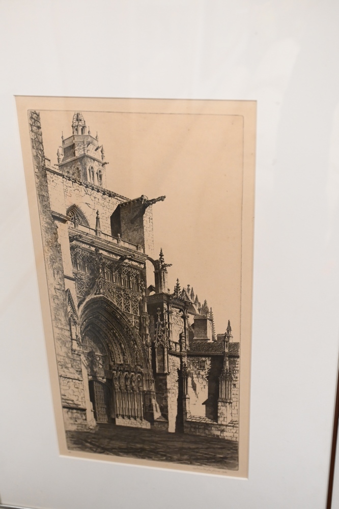 Lot 134: Group of Three Etchings by John Taylor Arms (American, 1887 – 1953), to include “La Tour de L’Horloge, Dinan”, 1932, 11 x 5 inches; “Memento Vivere, Notre Dame, Evreux” also called “The North Transept of Notre Dame Cathedral, Evreux, France”, 1947, 15 x 8 inches; along with “Spanish Profile III”, 1950, 15 x 8 inches.