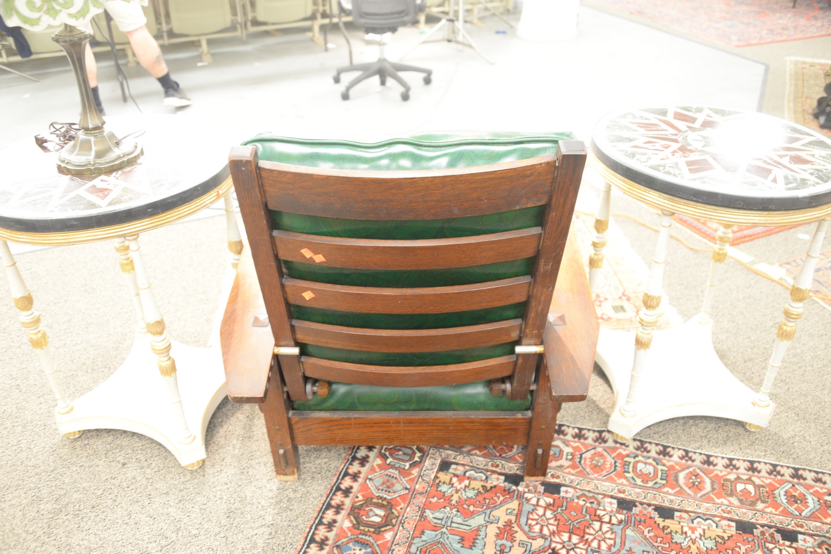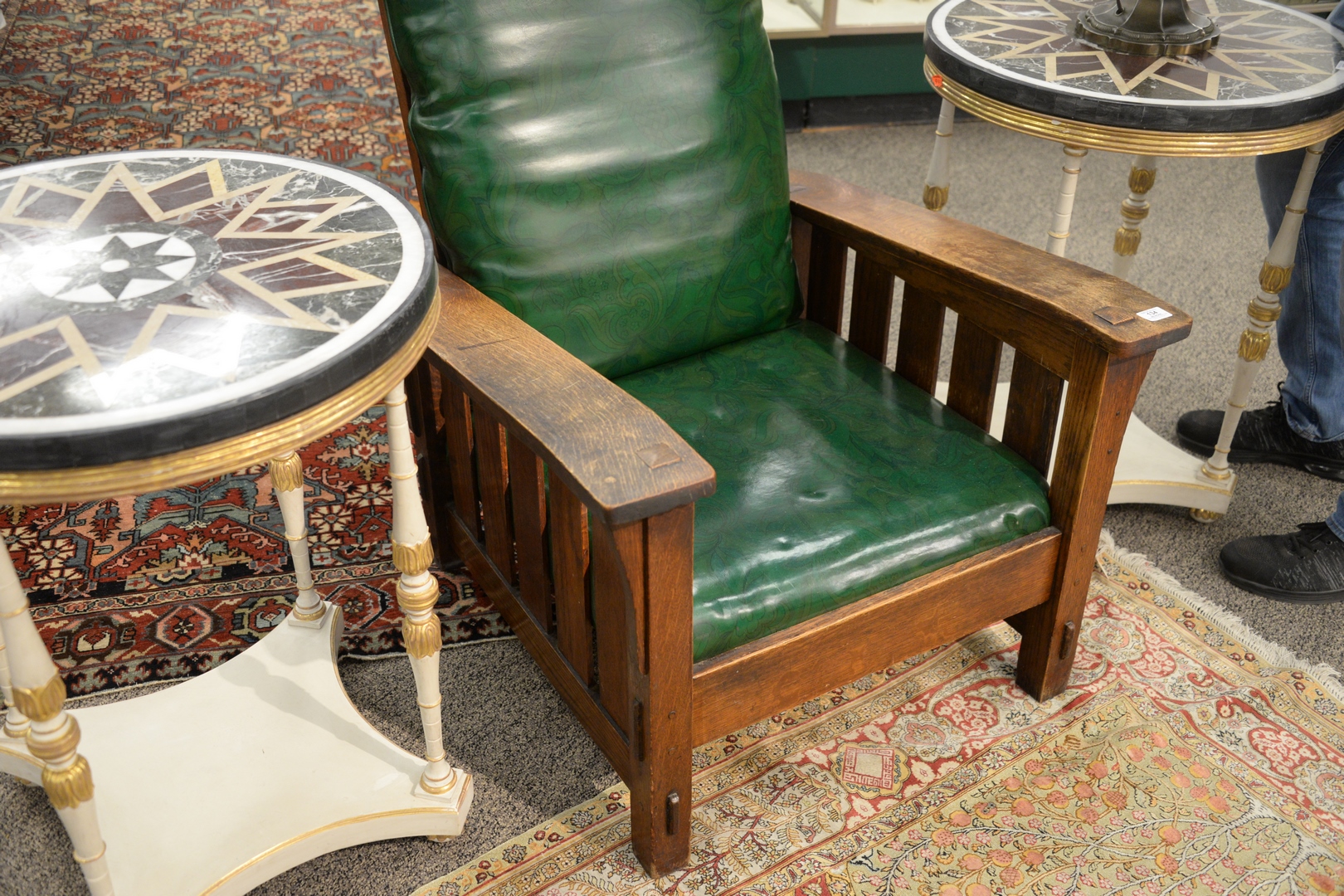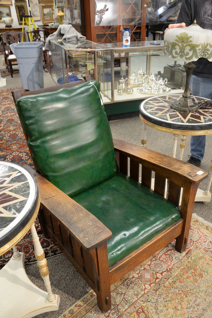 Lot 134: Gustav Stickley Oak Morris Chair, having bent or drop arms with five slats, #369, with green vinyl cushions, height 39 inches, width 32 1/2 inches.