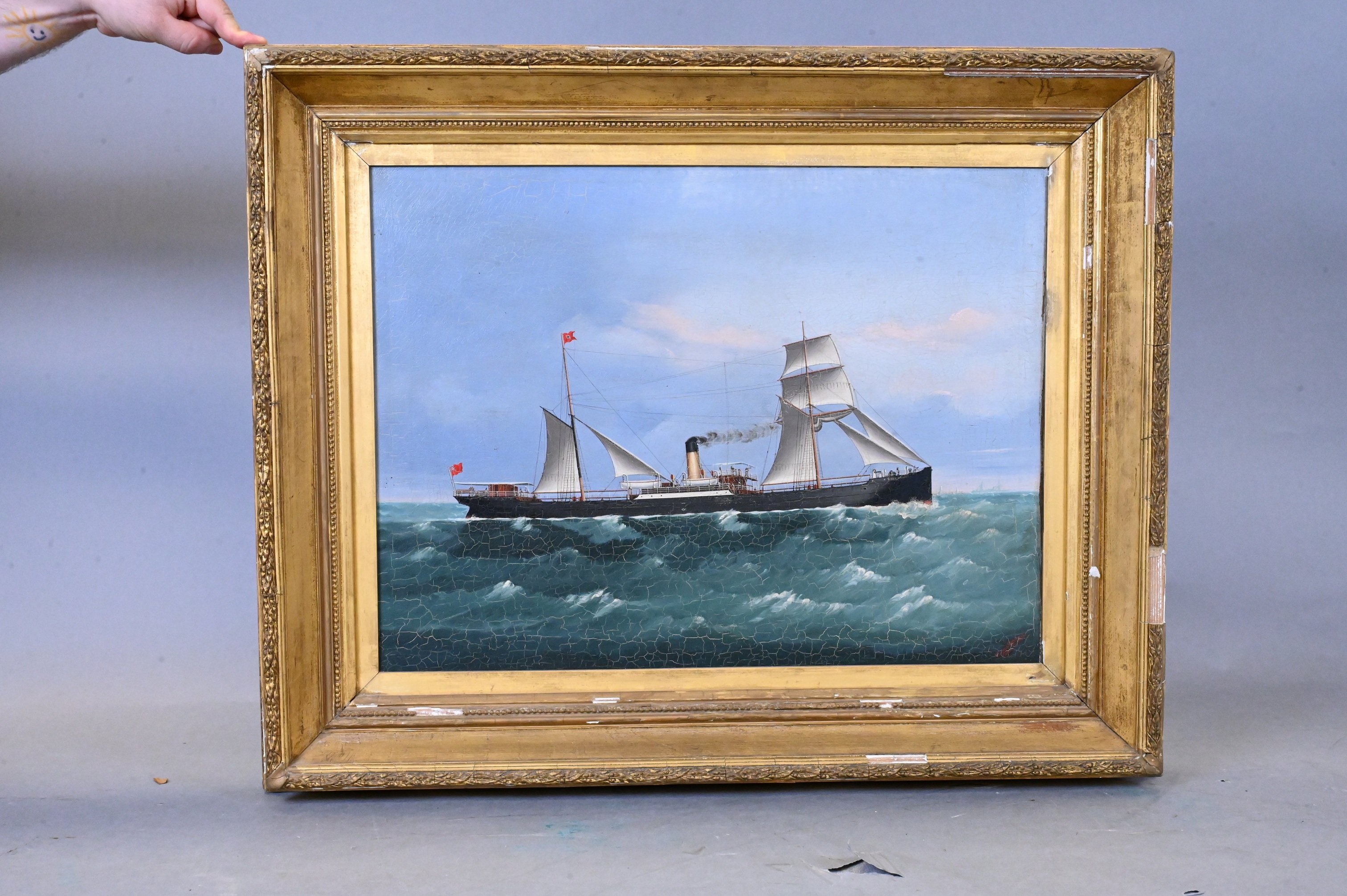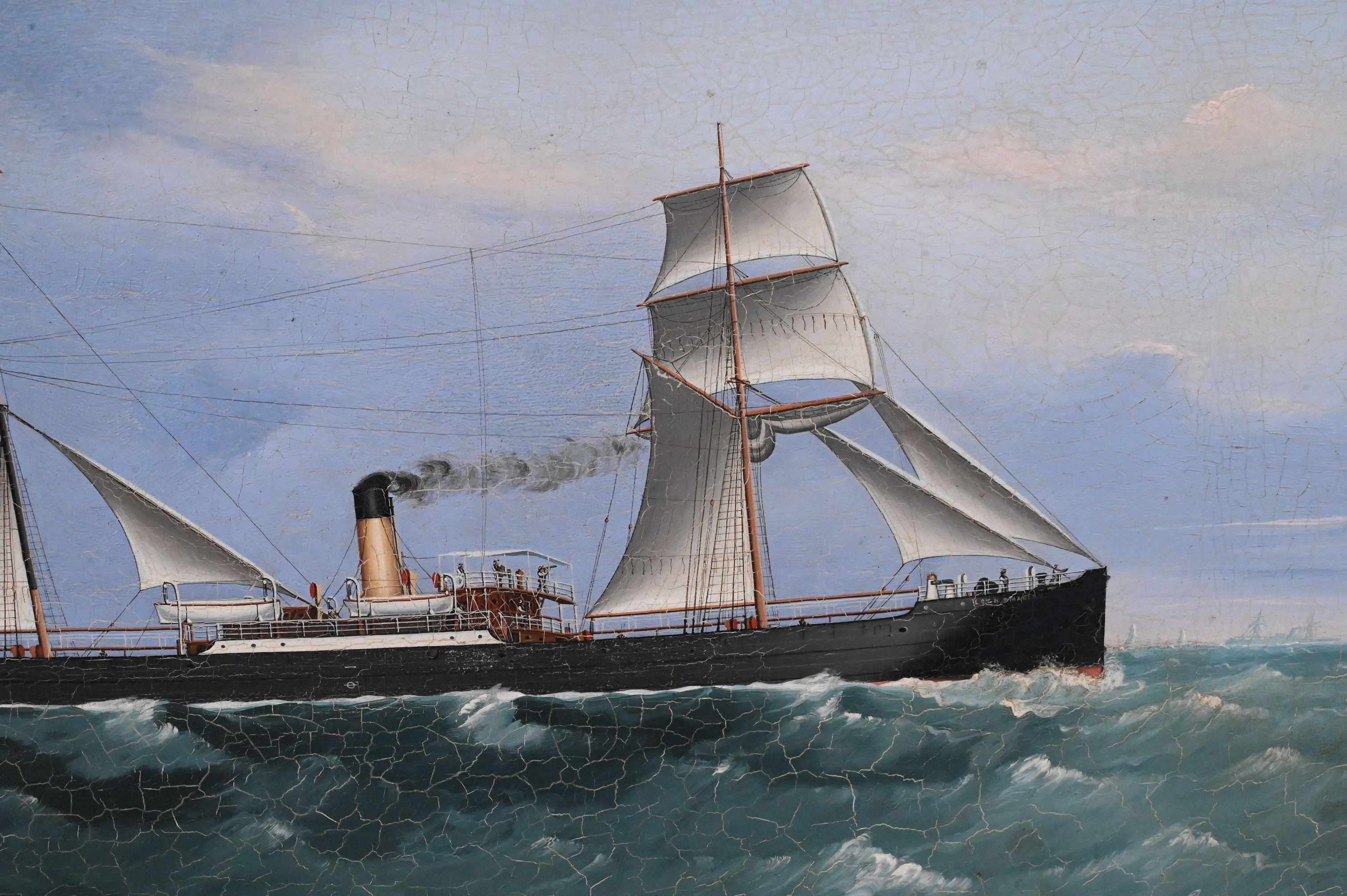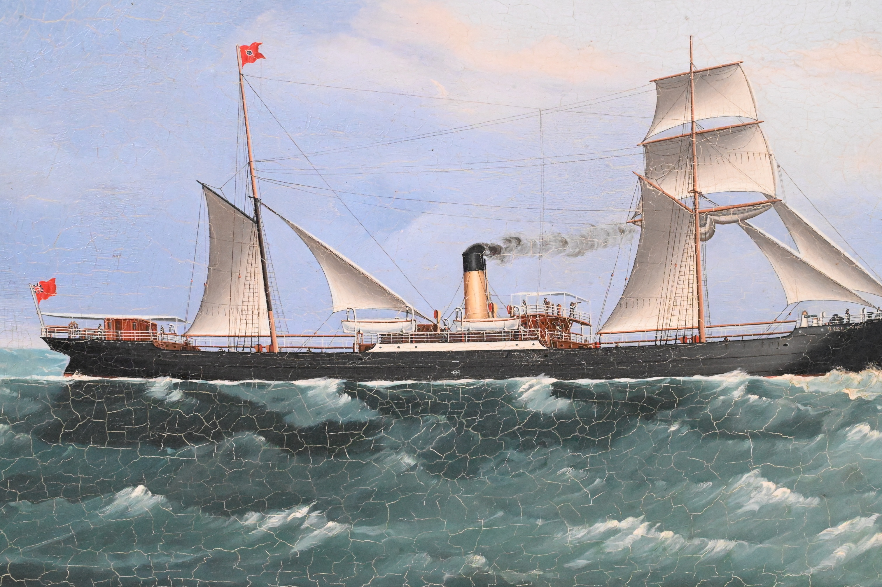Depicting a steamship with auxiliary sails set on a choppy green sea under a blue sky, flying red pennant and ensign. Painted in the precise style characteristic of Canton port painters who supplied ship captains and Western traders with commemorative portraits of their vessels